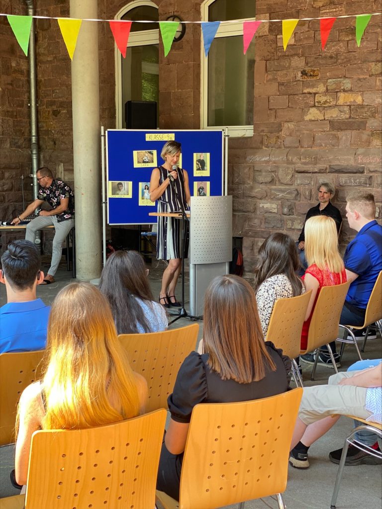 Am Freitag, den 23.Juli 2021 war es wieder so weit und wir konnten unsere 9Klässler*innen mit dem Zeugnis der Hauptschule entlassen. Bei strahlendem Sonnenschein fand die Feier unter coronakonformen Bedingungen im Hof statt. Nachdem die Absolvent*innen eingelaufen waren und die Gäste begrüßt hatten, richtete unserer Rektorin, Frau Kretschmer, ein paar Worte an sie und gab ihnen ihre besten Wünsche mit auf den Weg. Im Anschluss präsentierte die Klasse 9b ein Gedicht, in dem sie sich selbst mit einem Augenzwinkern beschrieb. Bevor die Klasse 9a ihren Programmpunkt präsentierte und das Lied „Die guten Zeiten“ gebärdete, bedankten sich die Schüler*innen noch bei ihren Lehrer*innen, was nicht selten zu ein paar Tränchen auf beiden Seiten führte.