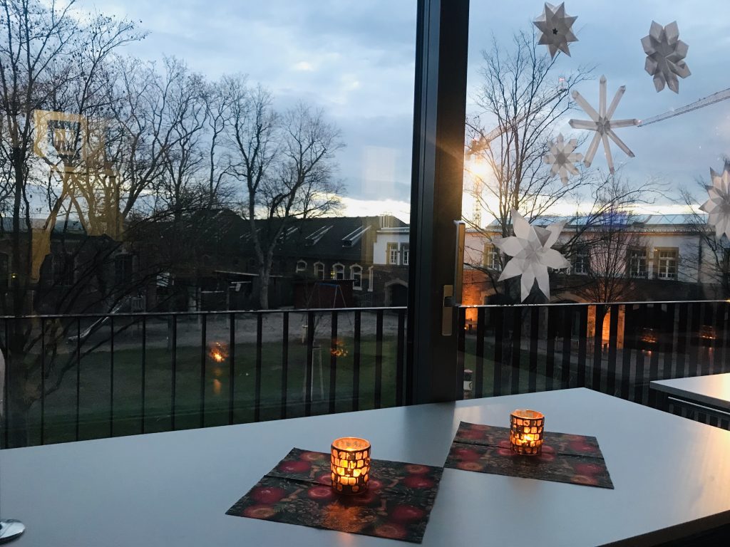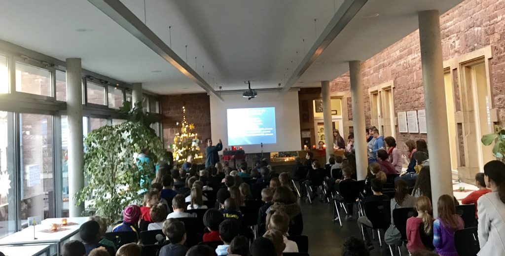 Auch in diesem Jahr erschallen wieder weihnachtliche Klänge durch unsere festlich geschmückte Mensa, wenn sich unsere Grundschüler*innen montagmorgens dort zum Adventssingen einfinden. Gemeinsam mit Frau Segnitz bereitet die Klasse 9a diese traditionelle Veranstaltung vor.