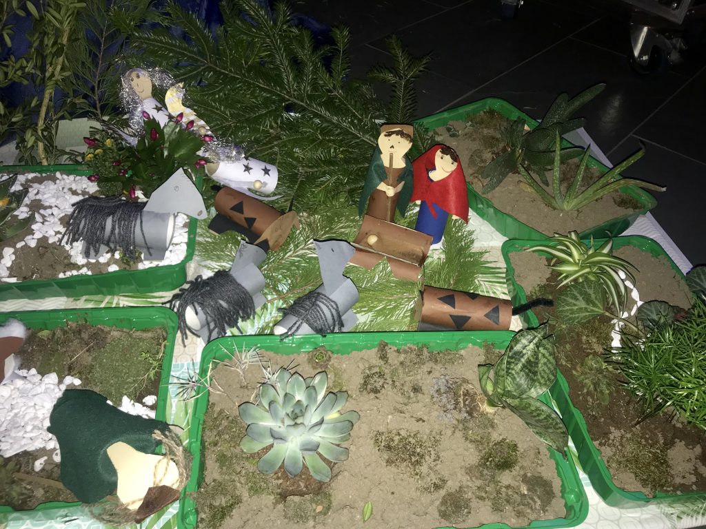 Unter dem Weihnachtsbaum kann von allen die Krippe bewundert werden. Sie wurde unter Anleitung von Frau Herdt von Schüler*innen des SOL „Schulgarten“ gestaltet.