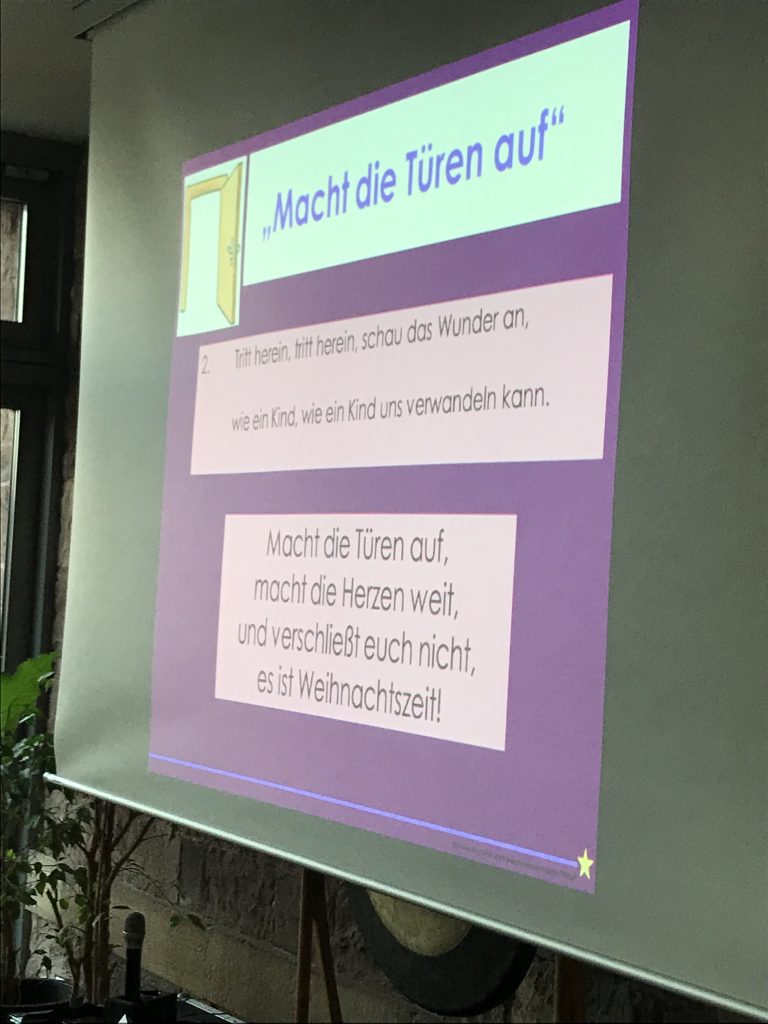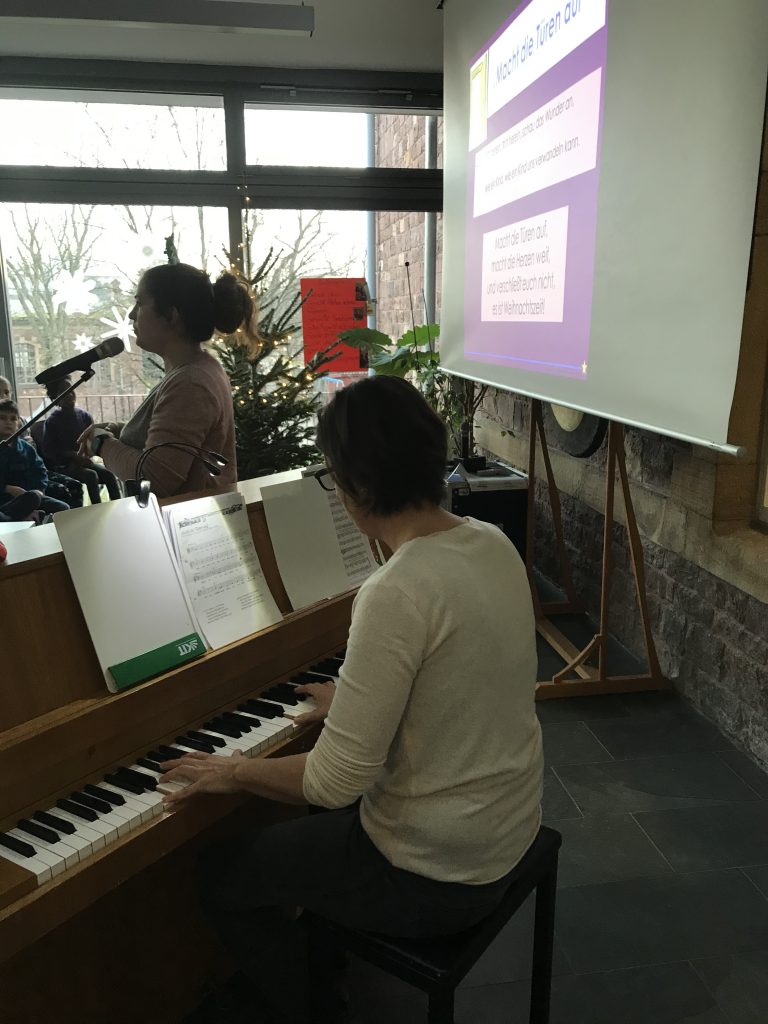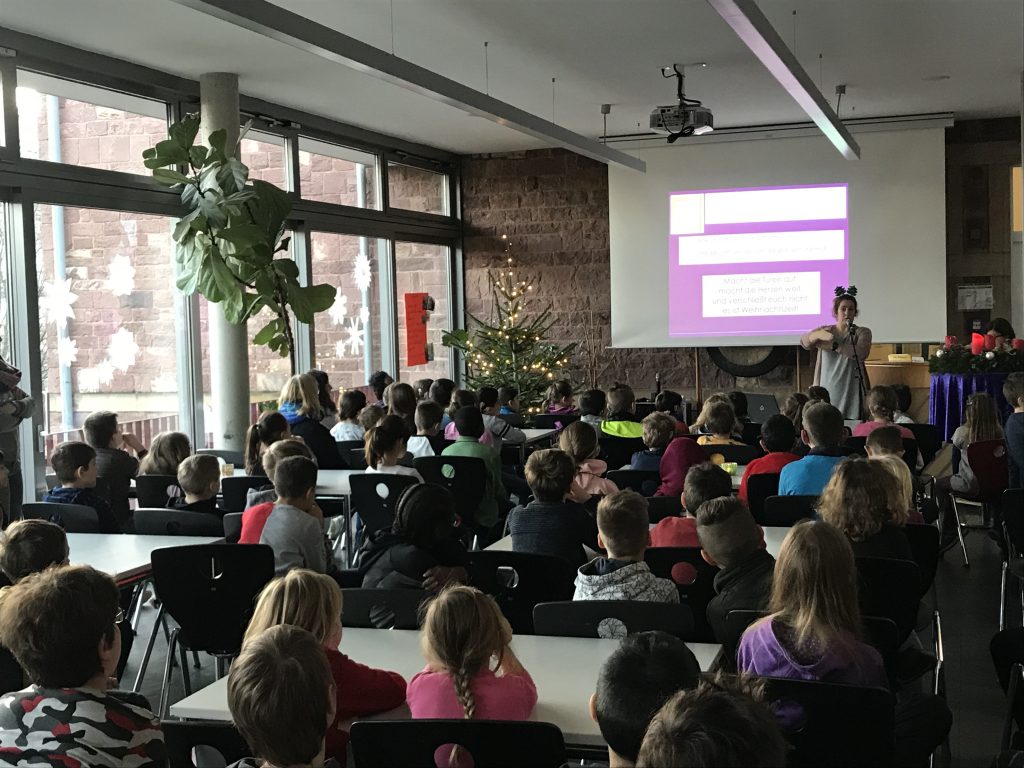 Am Montag, den 2. Dezember 2019 ertönten aus der festlich geschmückten Mensa wie jedes Jahr fröhliche und besinnliche Weihnachtslieder. Frau Bechberger, die das Adventssingen leitet, hat das Singen diesen Morgen unter das Motto „Warten auf Weihnachten“ gestellt. Gebannt lauschten die Kinder ihren Erzählungen über Jesus, dem Kind, das alles veränderte und auch der Geschichte vom Nikolaus, den ja alle ebenso sehnsüchtig erwarten. Zwischendrin sangen alle gemeinsam die Weihnachtsklassiker „Lasst uns froh und munter sein“, „Macht die Türen weit“, „Wir sagen euch an“ und „Zünd ein Licht an“, wobei sie von Frau Braasch am Klavier begleitet wurden. Ein besonderes Highlight des Adventssingens war unser neues Lied von Kurt Mikula „Bald ist Weihnachten“, welches in Gebärdenpoesie umgesetzt wurde.