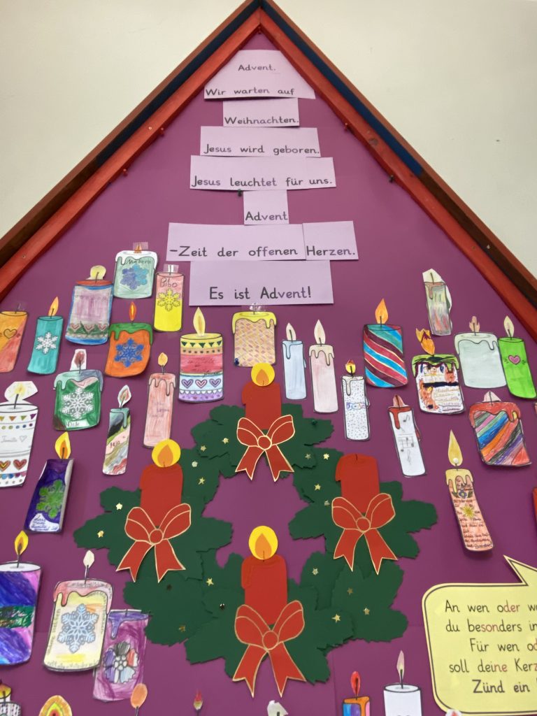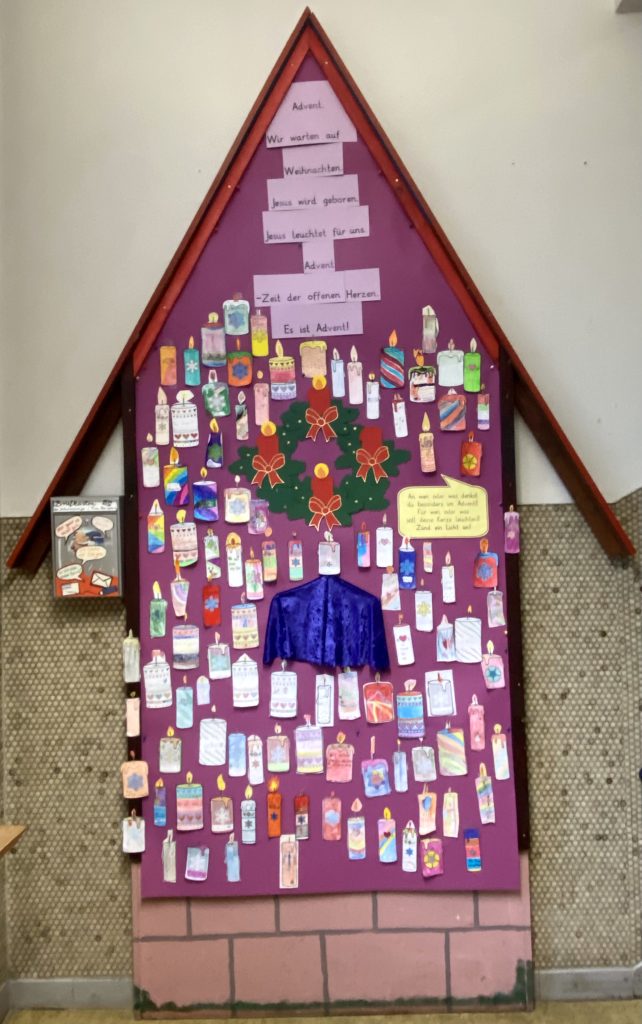 Zur Adventszeit hat sich unser Reli-Team wieder etwas besonderes einfallen lassen. Alle Schülerinnen und Schüler aus dem Sekundarbereich hatten die Möglichkeit, eine Kerze auf Papier selbst zu gestalten und darauf zu schreiben, für wen sie diese Kerze anzünden würden. Viele dachten an ihre Familien, an Freunde, Tiere, aber auch an verstorbene Menschen. Ein schönes Projekt, das zum Innehalten anregt. Vielen Dank den Initiatoren!