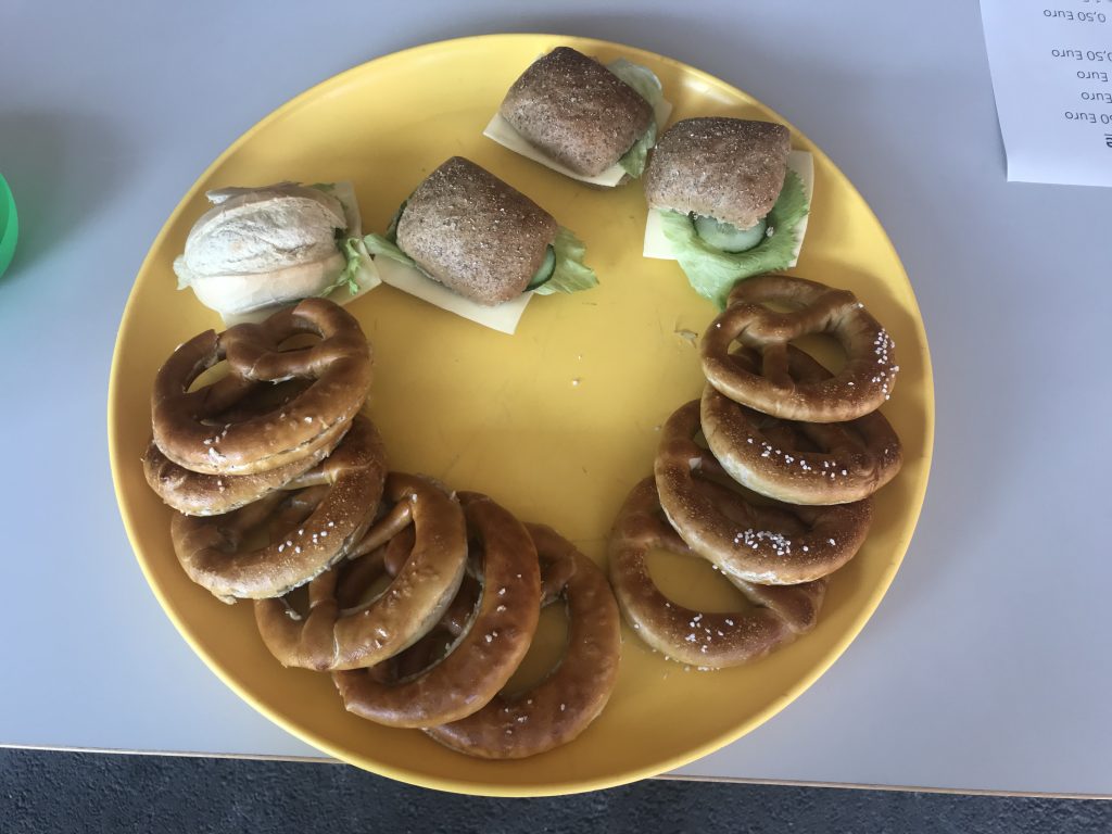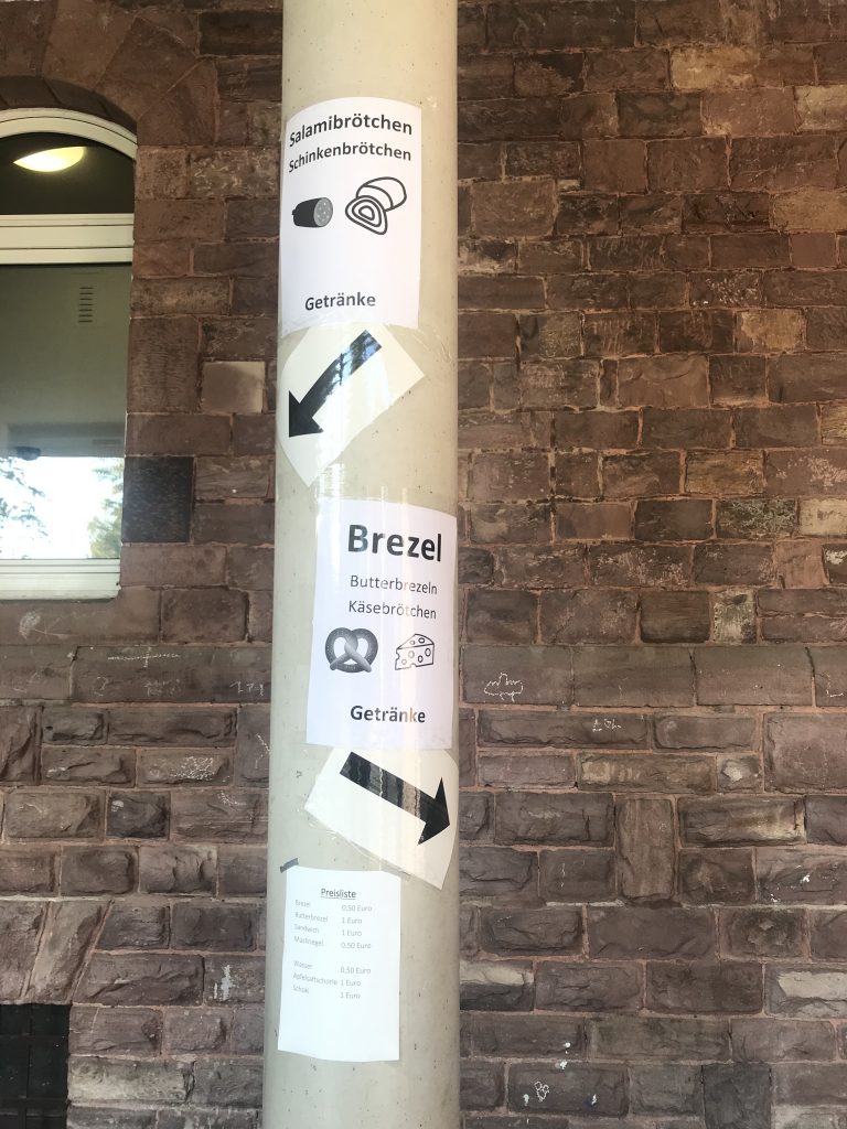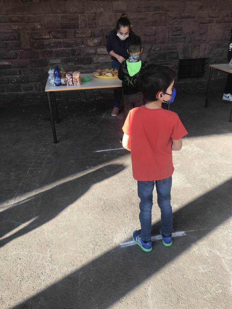 Das neue Konzept sieht vor, dass an drei Tischen im Hof unter der Mensa, die in genügend Abstand voneinander stehen, Brezeln, belegte Brötchen und Getränke angeboten werden. Dabei wird durch Linien auf dem Boden sichergestellt, dass sich weder Verkäufer*innen und Kund*innen noch die Kund*innen untereinander zu nahe kommen. Ein Konzept, das schon deshalb gut funktioniert, weil die Grund- und Sekundarstufe durch zeitlich unterschiedliche Hofpausen voneinander getrennt sind und sich so der Andrang beim Verkauf gut ordnen lässt.