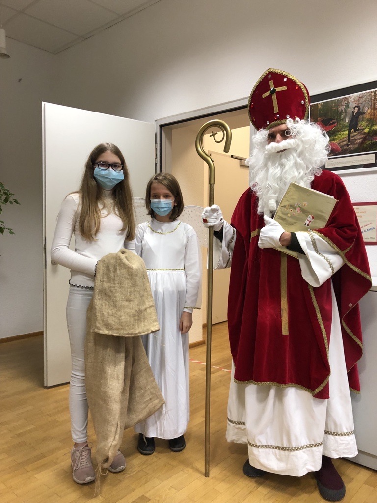 Strahlende Augen gab es heute vor allem bei den Grundschüler*innen, denn bei Ihnen schaute der Nikolaus in Begleitung seiner beiden Engel höchstpersönlich vorbei! Da der Nikolaus alles weiß, lobte er die Klassen erstmal für ihr Verhalten oder wies darauf hin, was in Zukunft besser klappen könnte. Danach verteilte er kleine Säckchen, die gefüllt mit Mandarinen, Nüssen und Schokolade waren.