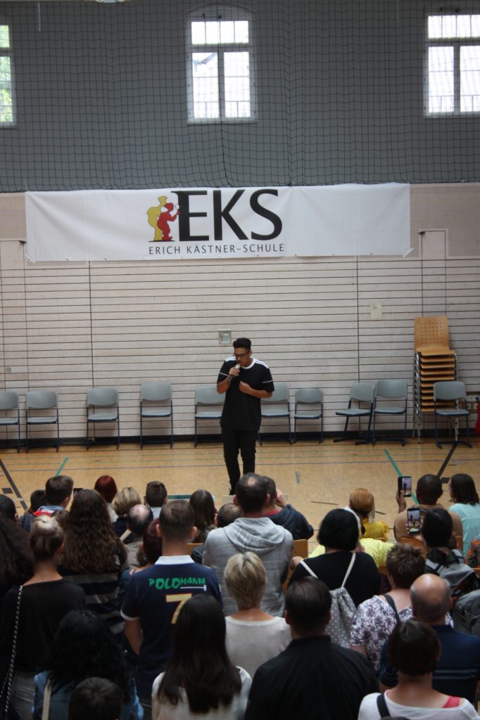 Den folgenden Programmpunkt gestaltete die Judo-SoL von Frau Witteler, die ihre erlernten Techniken präsentierten. Im Anschluss wurde es wieder musikalisch, denn die Klassen 3a und 4a hatten zusammen mit der Lehramtsanwärterin Frau Hahn eine Bodypercussion einstudiert. Malik aus der Klasse 8b überraschte danach alle mit dem Vortrag eines Rap- Songs, den er mit seiner Klasse und dem Karlsruher Rapper „bdad“ geschrieben hatte. Den Abschluss des Eröffnungsprogrammes bildete der Gebärdenchor, bei dem Schüler*innen und Lehrer*innen gemeinsam unter der Leitung von Frau Bechberger den Song „Alles ist jetzt“ performten.