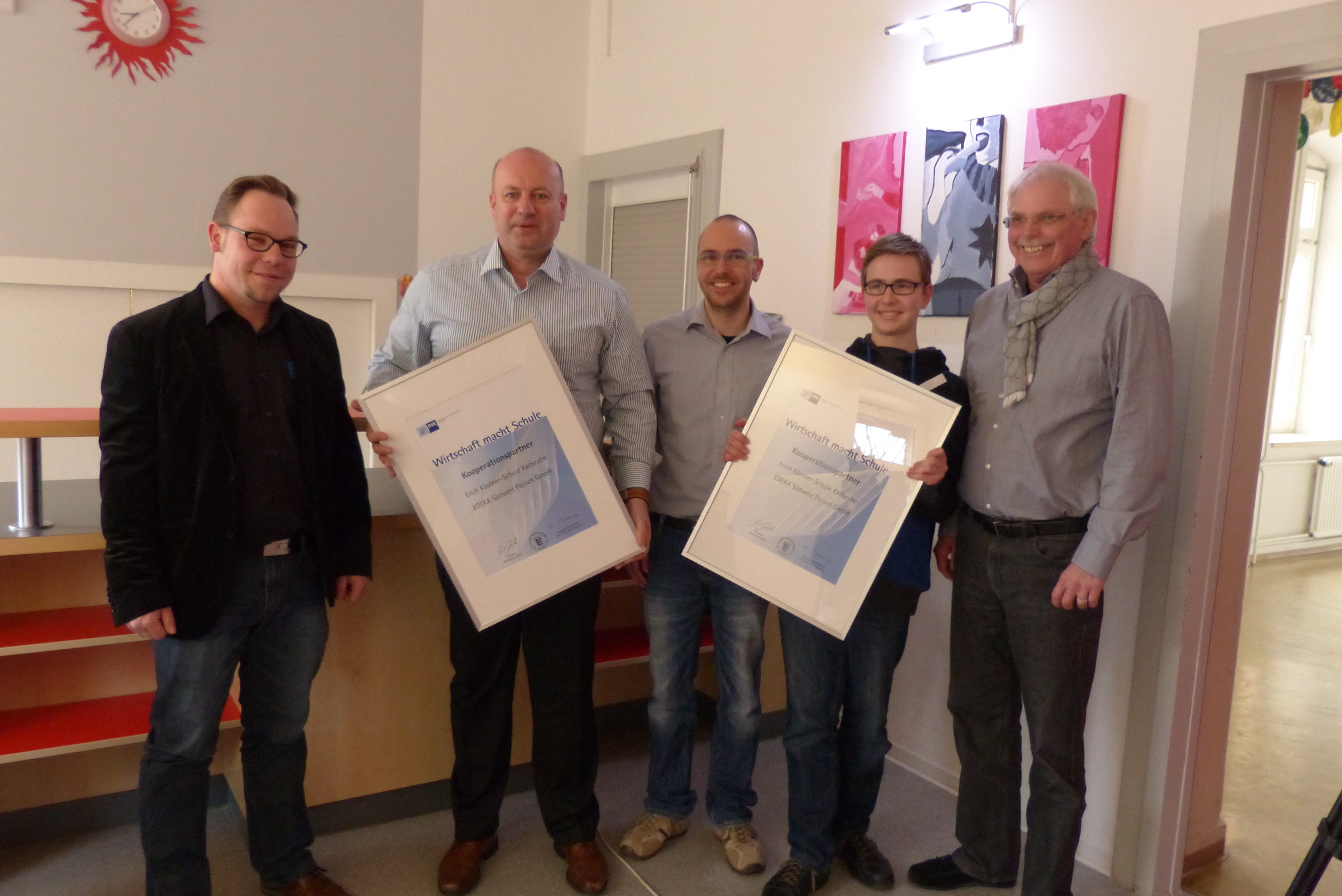 Nachdem Jan Hehl (Klasse 8a/b) in einem kurzen Vortrag unsere Schule und Schülerfirma vorgestellt hatte, wurde in den Räumlichkeiten des EKS-Cafés der Vertrag zwischen Frau Herzog von der IHK Karlsruhe, Herrn Mäder, dem Geschäftsführer von Edeka Südwest und Herrn Langel, dem Sonderschulrektor der Erich Kästner-Schule, unterschrieben.