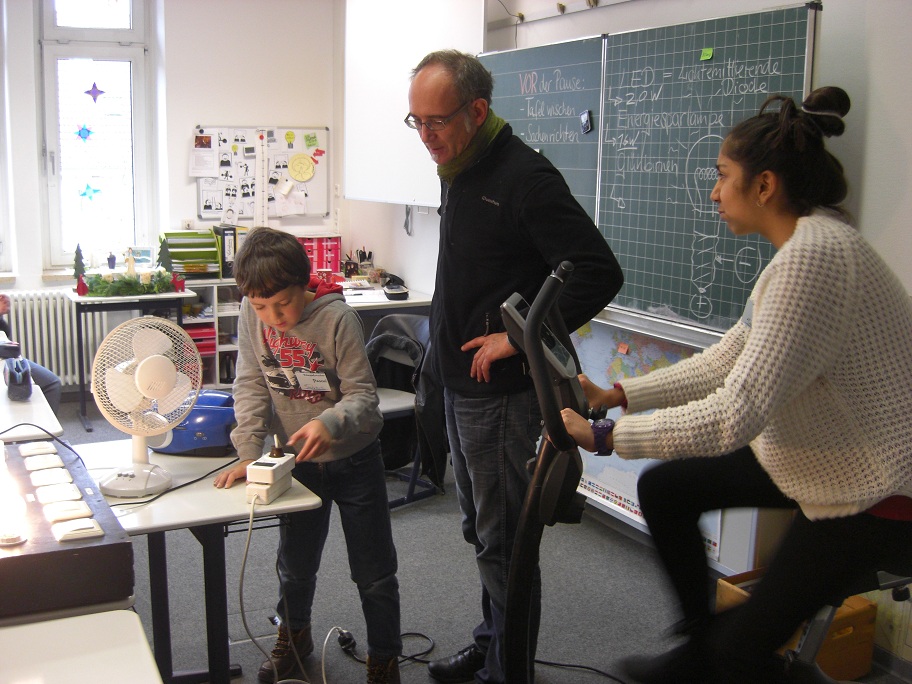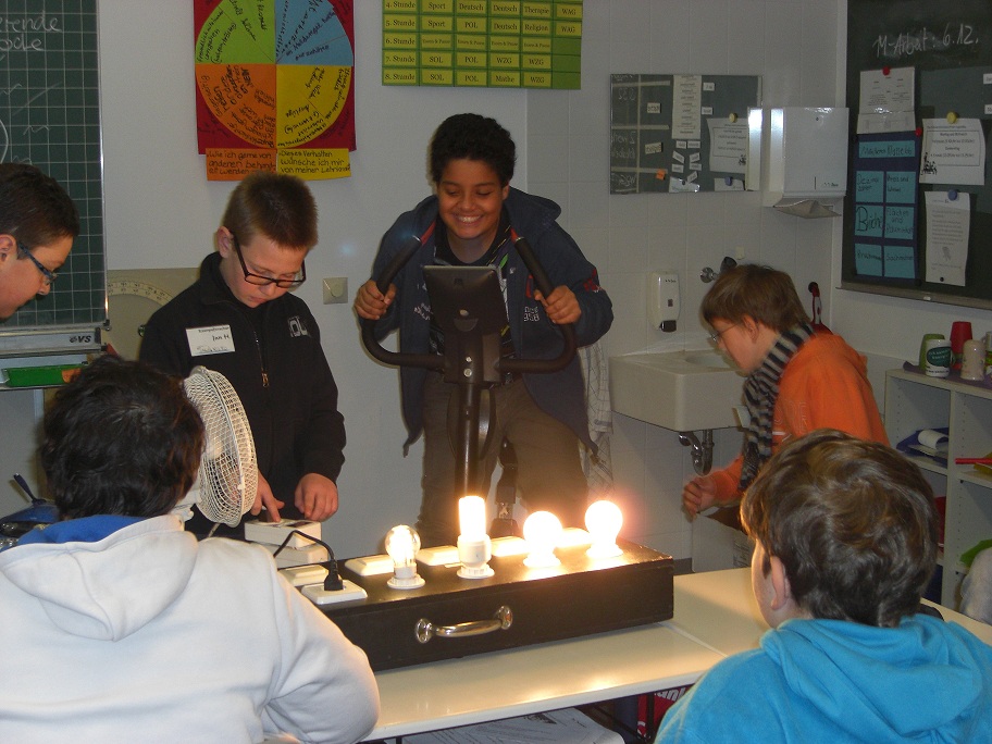 Wir mussten ganz schön strampeln, um die Glühlampen zum lLeuchten zu bringen. Am schwersten war es, eine 70W-Glühlampe zum Leuchten zu bringen. Die Energiesparlampe ging schon leichter. Aber am wenigsten Strom verbrauchte die LED. Wenn wir richtig schnell fuhren, konnten wir sogar ein Radio betreiben und Musik hören. Das war aber schon ganz schön anstrengend.
