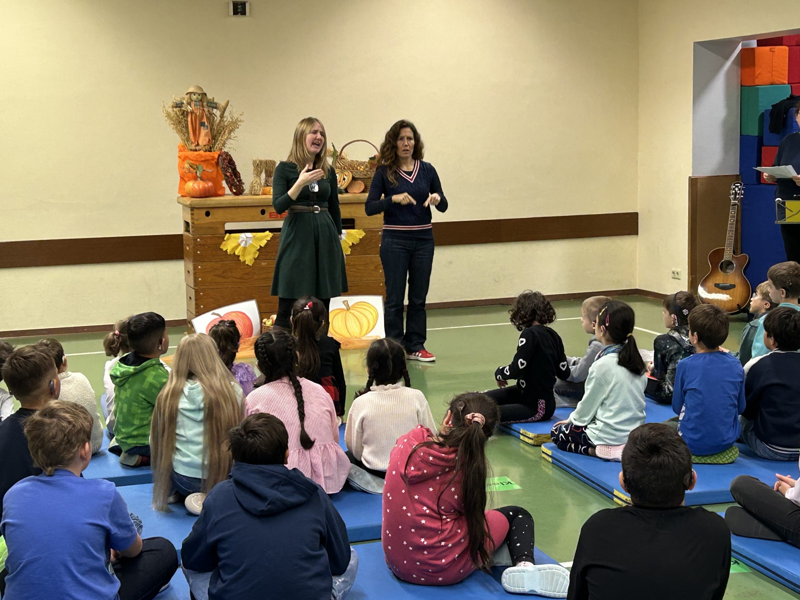 Auch in diesem Jahr wurde an der EKS wieder der Erntedank gefeiert. Dafür traf sich die Grundschule am Dienstag, den 21.Oktober 2025 in der kleinen Sporthalle, die wie immer festlich geschmückt war. Gemeinsam wurde viel gesungen, aber auch der Chor trug mit dem Lied „Herbstwind“ zum Programm bei. Den Rap „Hey Joe, spann den Trekker an“ performte die Klasse 4c und auch die Klassen 2b und 4b sorgten mit ihrem Lied „Hast du heute schon danke gesagt“ zur musikalischen Untermalung des Festes. Eine tolle Kooperation gab es zwischen den Klassen 1b und 4b, die gemeinsam das Gedicht „Regenschirme“ vortrugen. Dem stand der Gedichtvortrag „Wir danken für die Ernte“ der Klassen 2a und 3a in nichts nach. Zwischen den vielen tollen Programmpunkten war auch das Publikum gefordert und alle hatten viel Spaß beim Lösen der Herbsträtsel.
