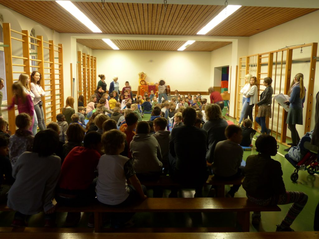 Zwischen den einzelnen Beiträgen gab es immer wieder Lieder, bei denen alle Kinder mitsingen konnten, z.B. das Lied „Der Herbst ist da“. Viel Freude hatten auch alle beim Lied „ Hast du heute schon Danke gesagt?“, bei dem die Klassen 1a, 2a, und 3a die Gebärden vormachten.