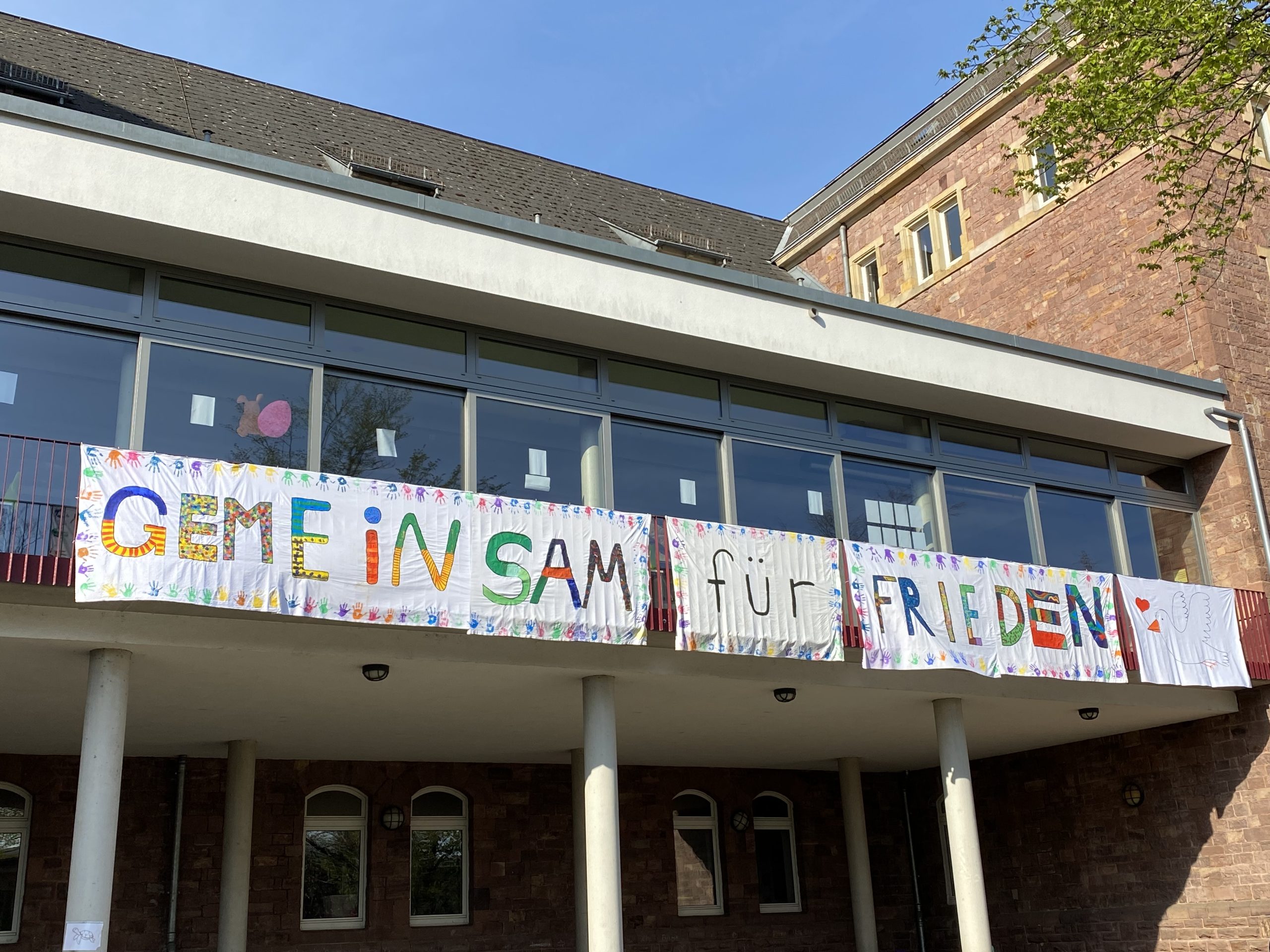 Initiiert wurde die Aktion von Frau Bernstein und Frau Lassahn, die gemeinsam mit einigen Klassen aus dem Bereich Sekundarstufe I aus Bettlaken einen riesigen Banner gestalteten, auf dem „Gemeinsam für Frieden“ zu lesen und eine Friedentaube zu sehen ist. Umrandet sind die bunten Letter mit den Handabdrücken von allen Schüler*innen und Lehrer*innen der Erich Kästner-Schule, denn wir alle wünschen uns nichts mehr, als in einer friedlichen Welt zu leben.