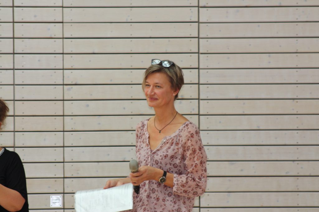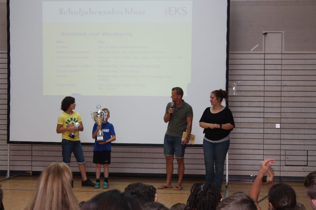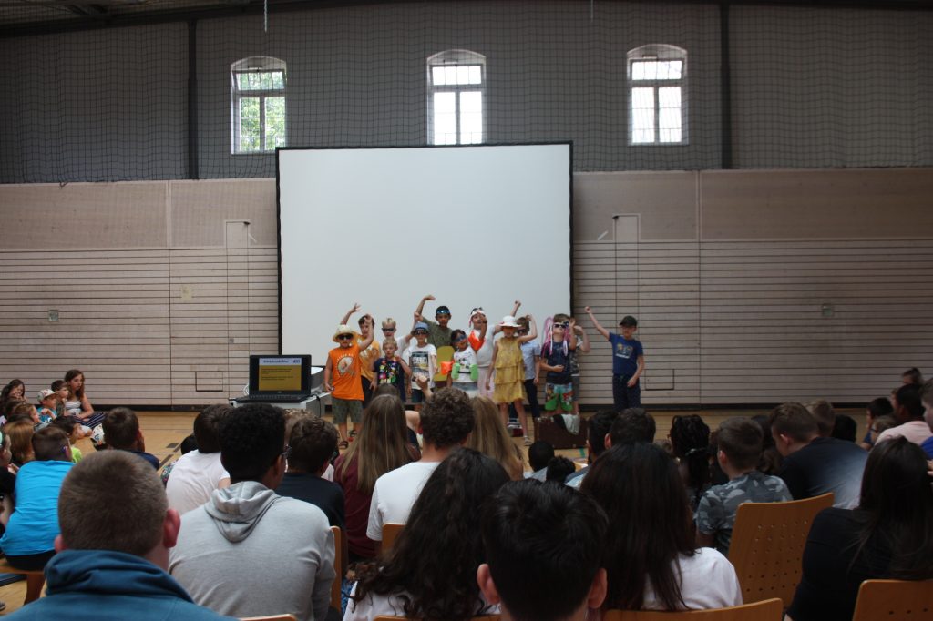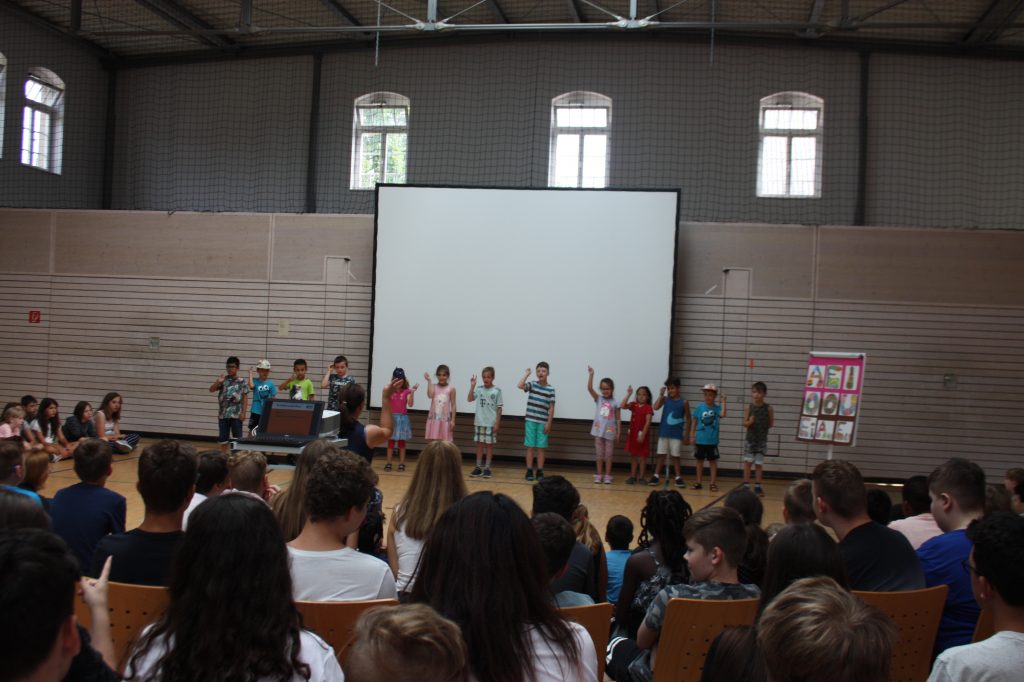 Am Montag, den 22. Juli 2019 versammelte sich die gesamte Schule in der EKS-Halle, wo sie von unserer Rektorin, Frau Kretschmer, zum gemeinsamen Schuljahresrückblick begrüßt wurden. Musikalisch eröffnet wurde die Veranstaltung von den Schüler*innen der Klassen 1a und 2a, die unter der Leitung von Frau Müller das Lied „Alle Kinder lernen lesen“ gebärdeten.