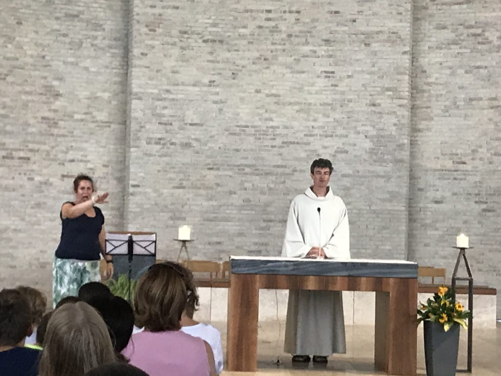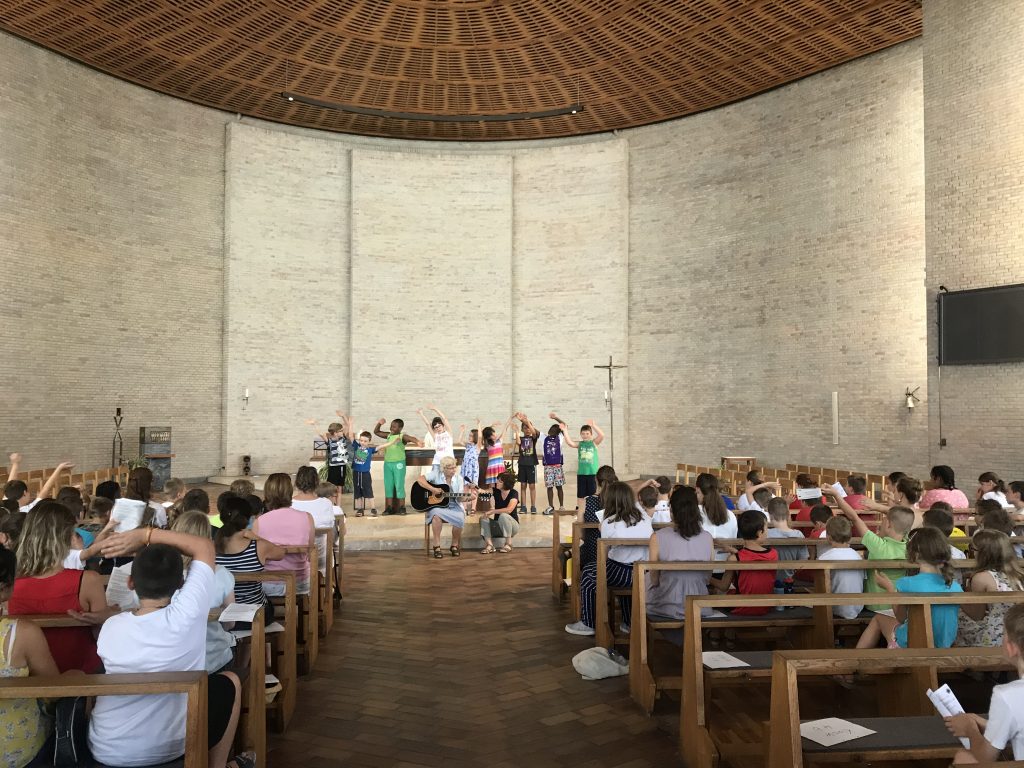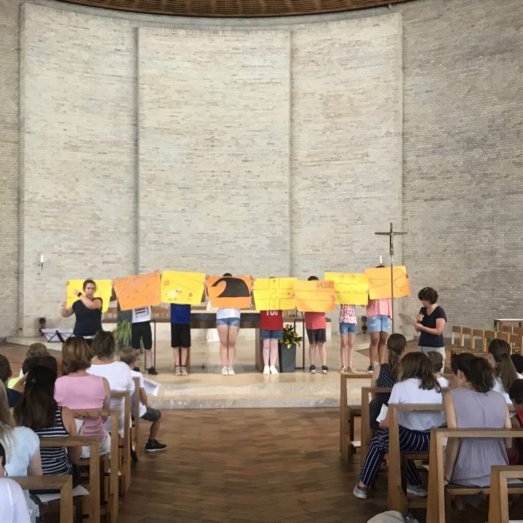Am vorletzten Tag in diesem Schuljahr hatten alle Schüler*innen der Erich Kästner-Schule mit ihren Lehrer*innen die Möglichkeit, in der St. Konrad Kirche einen gemeinsamen Gottesdienst zu feiern. Organisiert und durchgeführt wurde dieser Gottesdienst von unserem Reli-Team, das vom Gemeindereferenten Volker Schwab unterstützt wurde, der auch die Begrüßung übernahm. Anschließend sangen und gebärdeten die Kinder aus den Klassen 1b und 1c das Lied „In jeder Blume“, wobei alle eingeladen waren, mitzumachen.