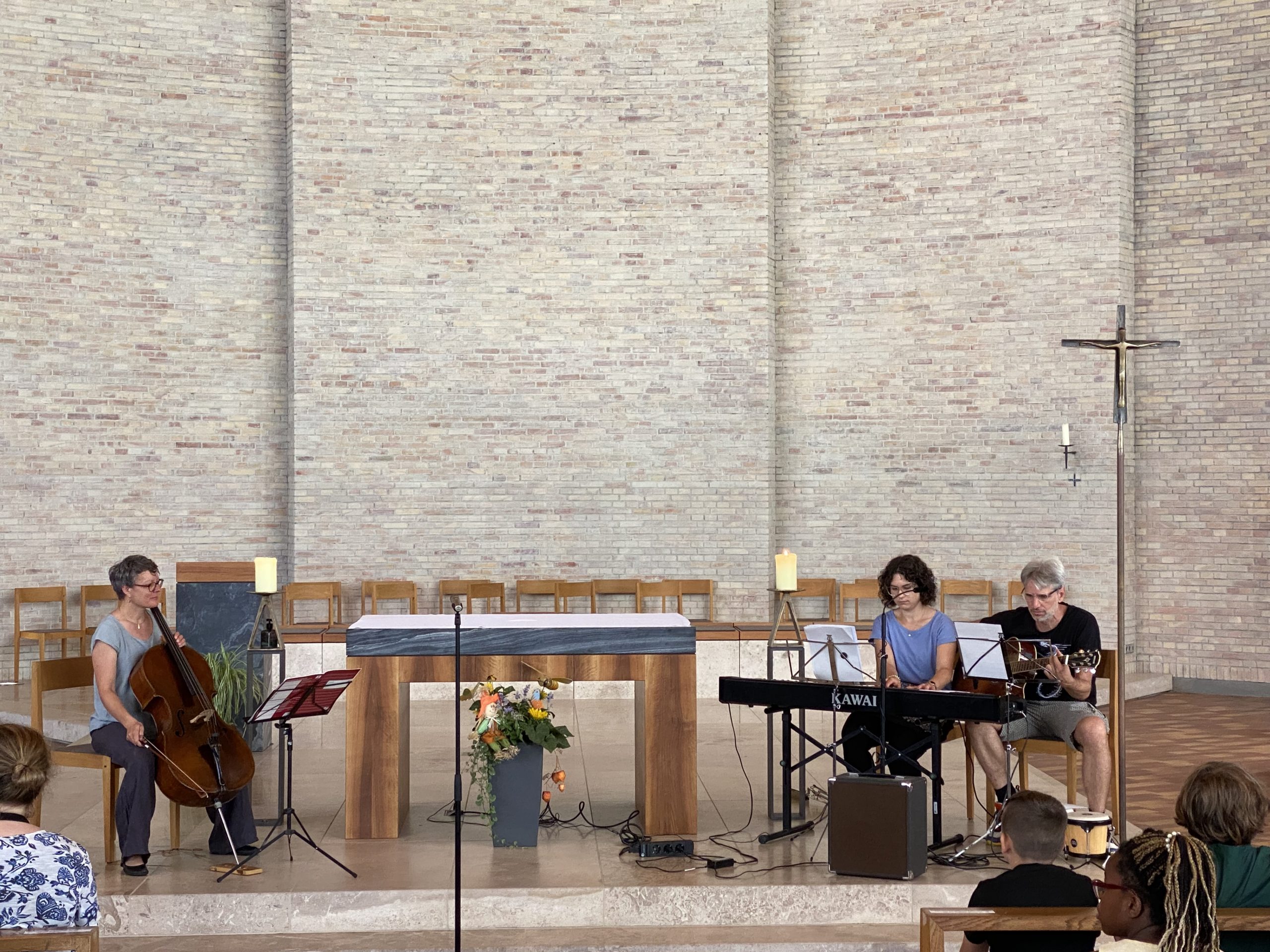 Frau Hahn (Cello), Herr Rimmele (Trommel, Gitarre) und Frau Stiegler (Klavier) stimmten die Anwesenden mit einem Instrumental auf die Andacht ein, bevor die Klassen 3a und 4a gemeinsam mit Frau Richter zu dem Lied „Spitze, dass du da bist“ mit passenden Tanzbewegungen die Stimmung auflockerten.
