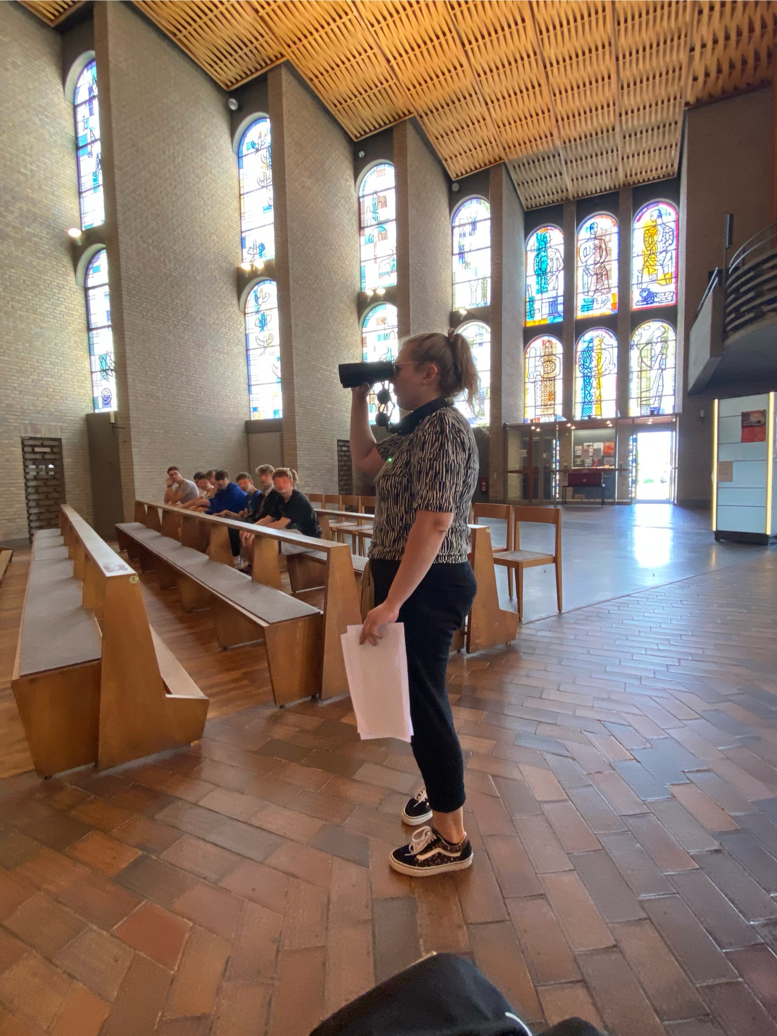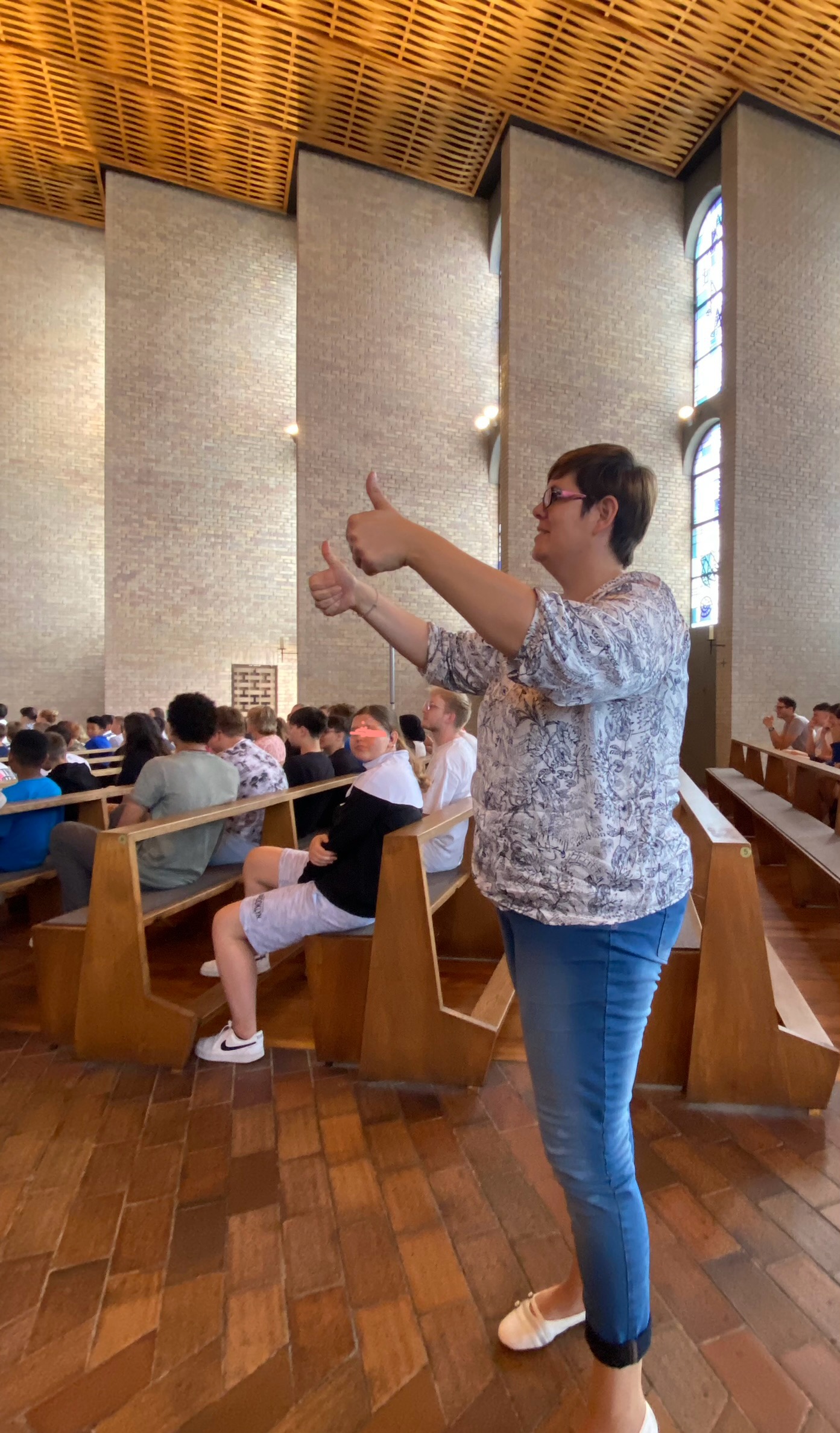 Das darauffolgende Vaterunser wurde von der Klasse 7b mit Gebärden untermalt. Danach durften alle Schülerinnen und Schüler sowie Lehrerinnen nach vorne kommen, die uns im kommenden Schuljahr verlassen werden, um ihren Segen entgegenzunehmen, während alle „Das wünsch ich dir“ sangen.