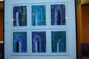 Gezeigt wurden hier verschiedene Werke unserer SchülerInnen, welche sie mit den Kunstlehrerinnen Frau Koppe, Frau Maurer und Frau Schlick im Laufe des Schuljahres erarbeitet haben. So besuchten beispielsweise die 9Klässler eine Ausstellung von Gerhard Richter und ließen anschließend in einem Workshop ihren Eindrücken freien Lauf. Dabei malten sie mit Gouachefarben ihre eigenen Bilder mit dem Titel „Die Kerze“ und gestalteten außerdem mit Spachteltechnik ein Gemeinschaftswerk, das sich sehen lassen kann.