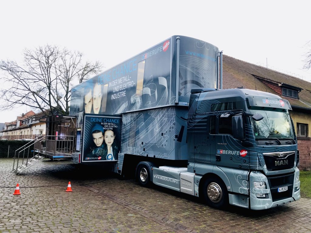 Viel Aufregung und Neugier löste der zweistöckige Truck der Metall- und Elektroindustrie aus, der seit dem 30. Januar 2020 auf unserem Hof steht. Der Truck sieht nicht nur von außen toll aus, sondern er hält auch von innen, was er verspricht. Auf Videowänden, sind Animationen und Kurzfilme über Berufe in der Metall-und Elektroindustrie zu sehen. Außerdem laden viele tolle Stationen unter Anleitung von zwei Fachmännern zum Ausprobieren und Experimentieren ein. Dort können unsere 7.-9.- Klässler*innen am Freitag, den 31.Januar und Montag, den 03.März 2020 erste praktische Erfahrungen im Bereich Metall und Elektronik sammeln, indem sie Fahrstühle programmieren, eine CNC-Fräsmaschine ausprobieren sowie weitere spannende kleinere Projekte umsetzen.