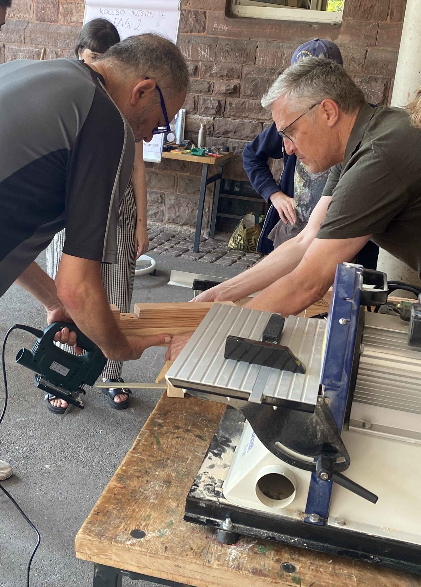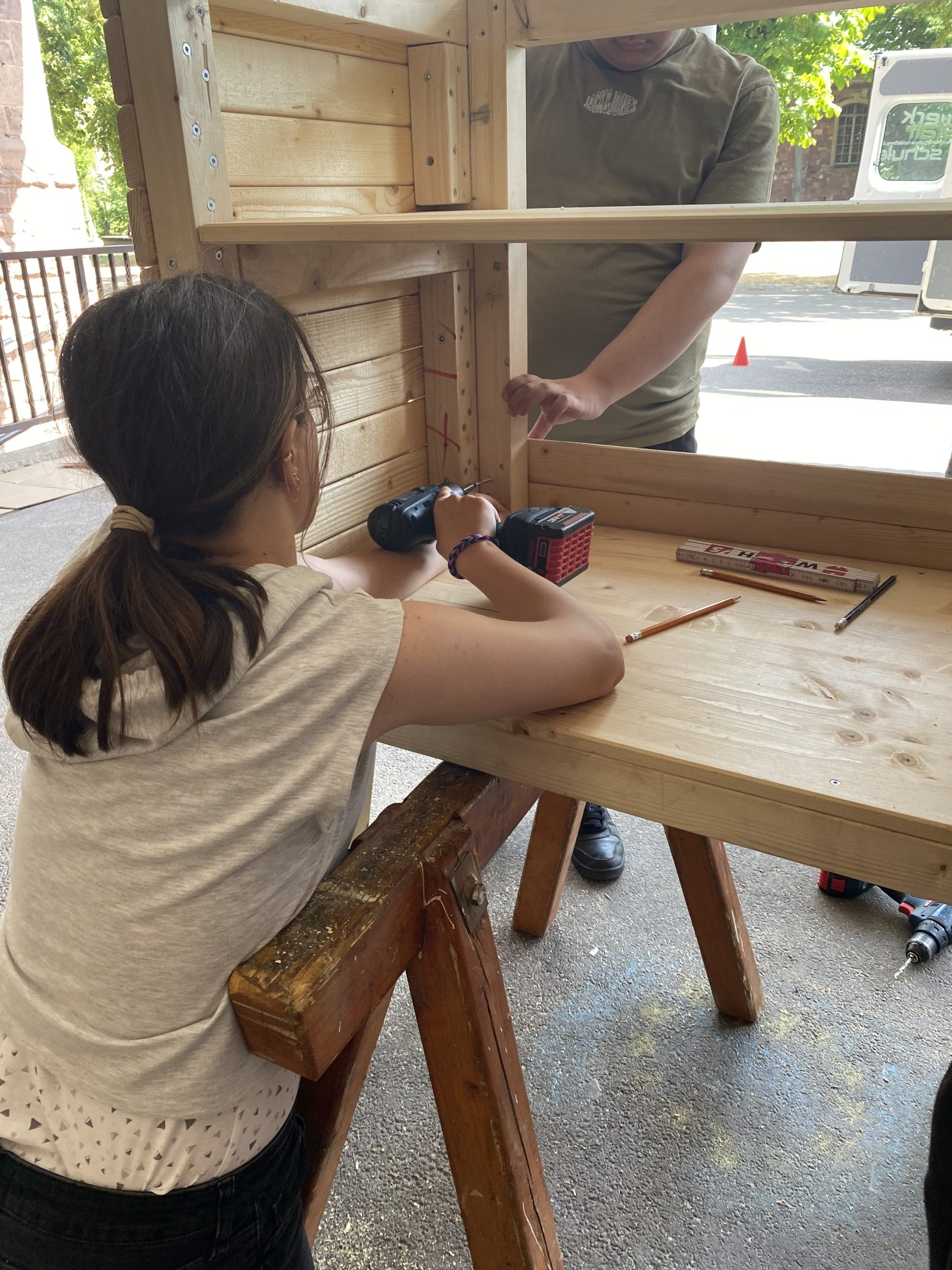 Die zweite Gruppe, die den Verkaufsstand gebaut hat, wurde von Anja und Loïc betreut, die über das KooBo-Projekt zu uns an die Schule kamen. Dabei wurde das Gerüst des Verkaufsstandes in drei Tagen fertig gebaut. Nebenbei haben sie noch zwei Werbetafel gebaut, um die Preise vom EKS-Shop mit Kreide drauf zu schreiben.