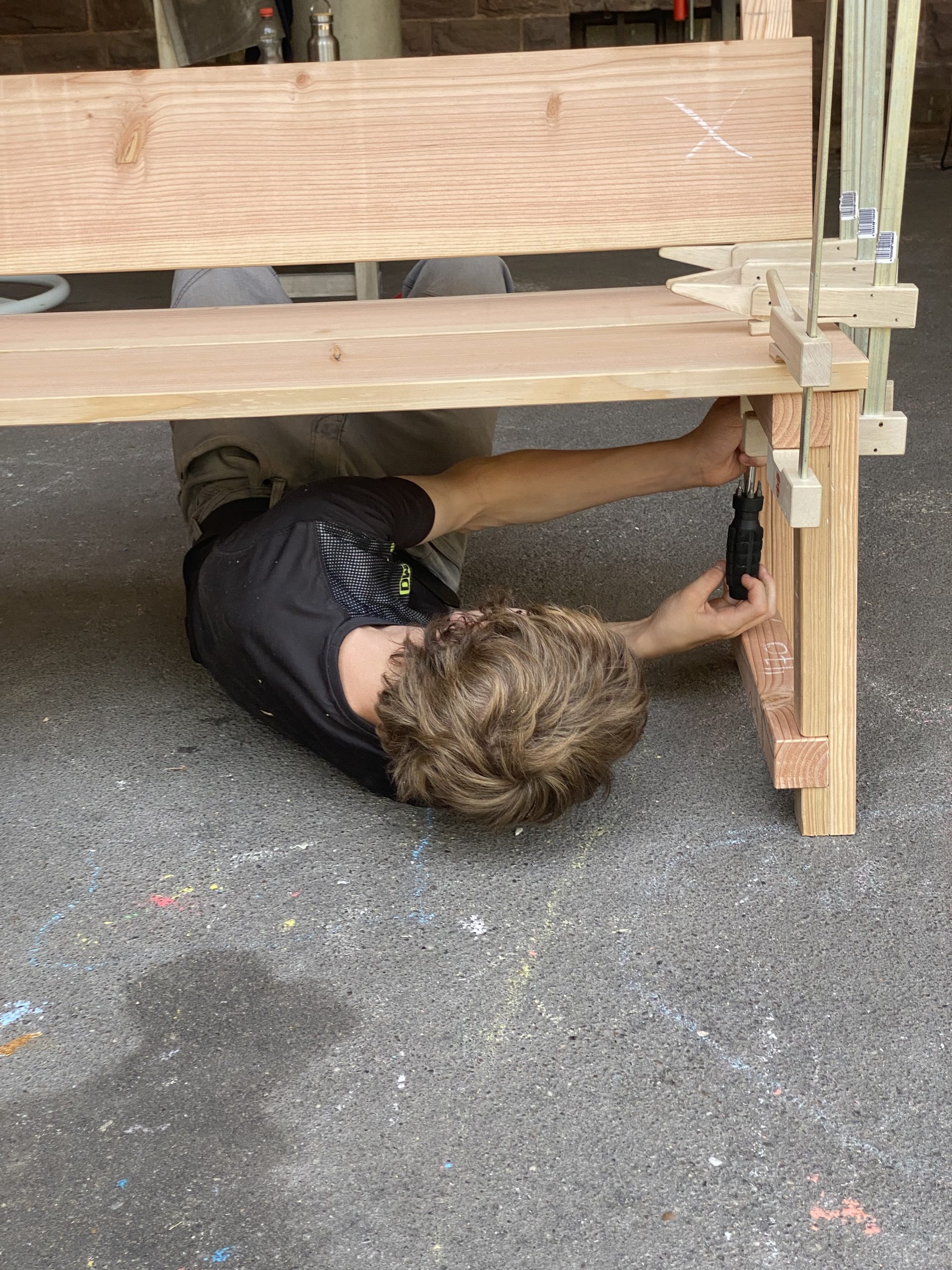 Parallel hat Herr Ehmann mit sechs Schüler*innen sogenannten „Wheelbenches“ gebaut. Das sind Bänke, die man dorthin schieben kann, wo sie gebraucht werden. Ebenfalls ein tolles Projekt, für dessen Planung und Umsetzung wir Herrn Ehmann danken!