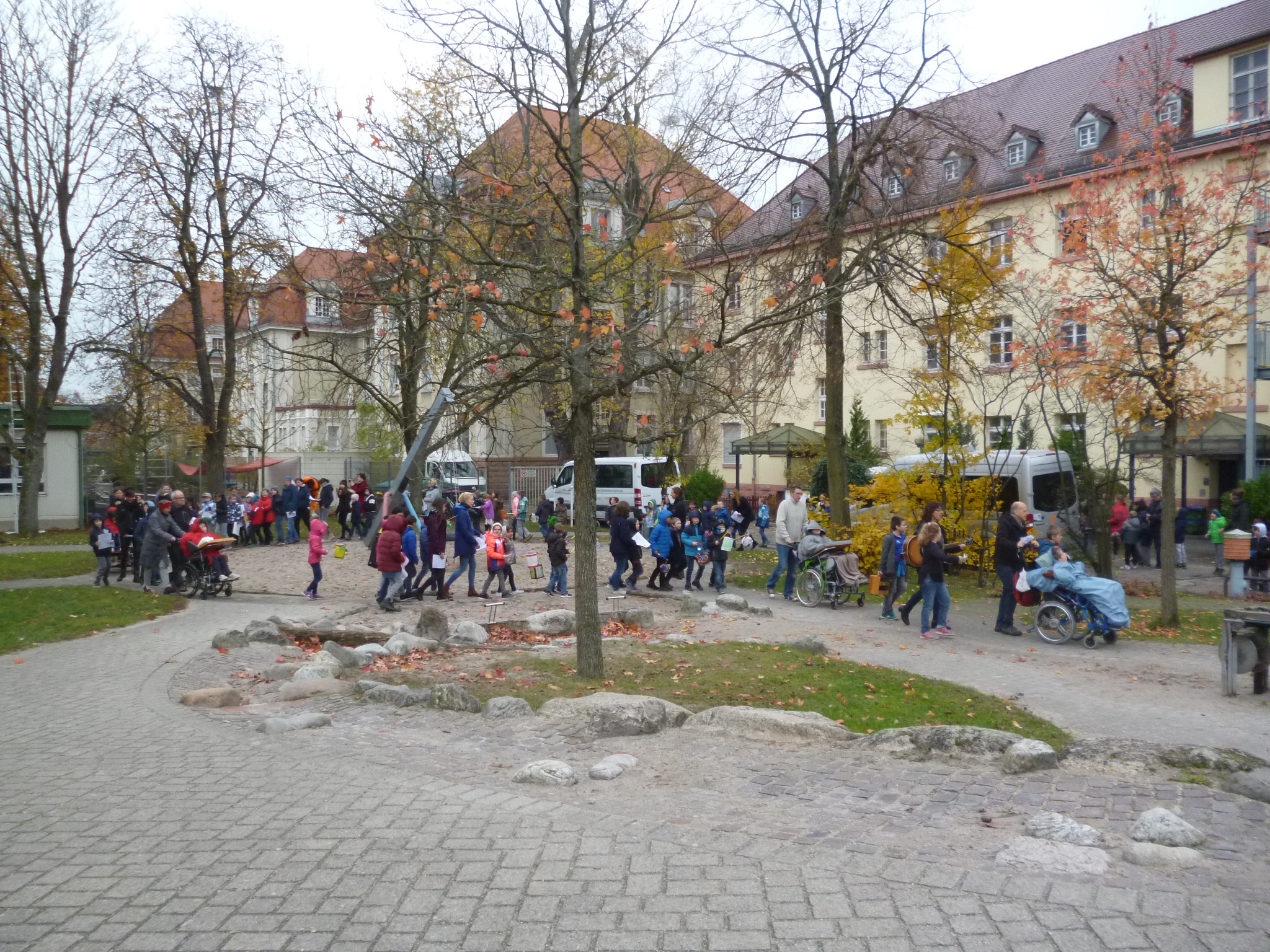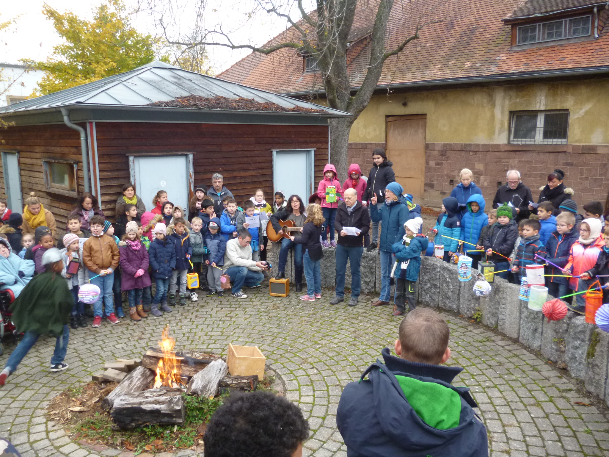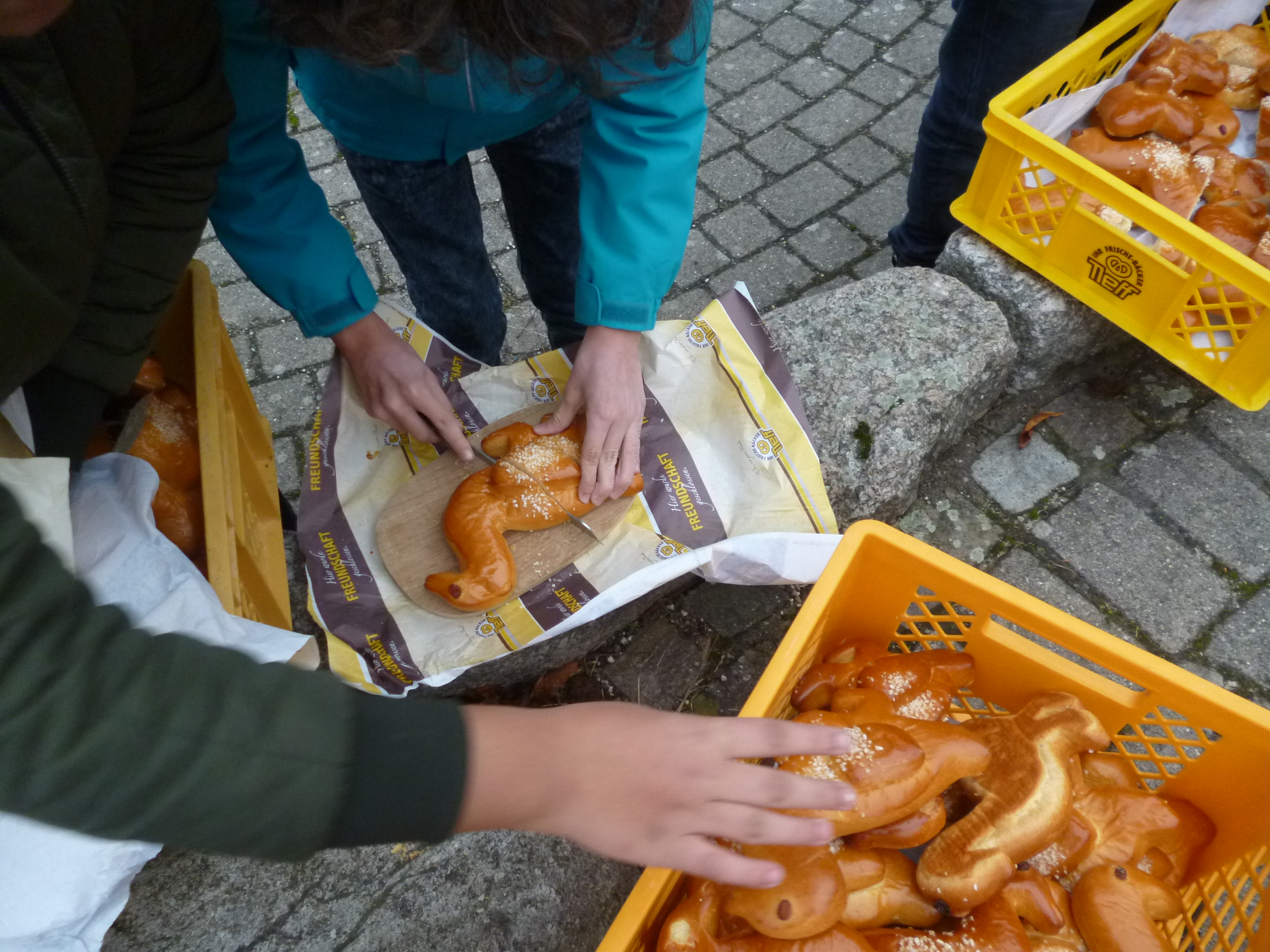 Am Freitag, den 10. November 2017 feierten die Grundschüler traditionell den Tag des Heiligen Martin. Um 9:00 Uhr trafen sie sich dafür in der EKS-Halle und sahen dort in einem kurzen Theaterstück der Sketch-up-AG die Geschichte des St. Martin, der seinen Umhang mit einem armen Mann teilte. Anschließend sangen sie, begleitet von Frau Heinold an der Gitarre, die ersten Strophen von „Ich geh mit meiner Laterne“, „Sankt Martin“ und „Ein bisschen wie Sankt Martin“. Dann durften die Kinder ihre Laternen anmachen und zum Laternenumzug im Schulgelände gehen. Dabei sangen alle die vorher geübten Lieder und versammelten sich zum Abschluss um ein Lagerfeuer, wo sie die von der Schülerfirma bereitgestellten Hefegänse miteinander teilten.