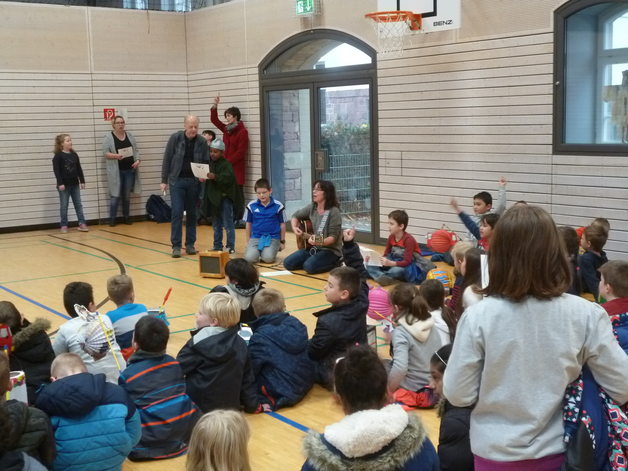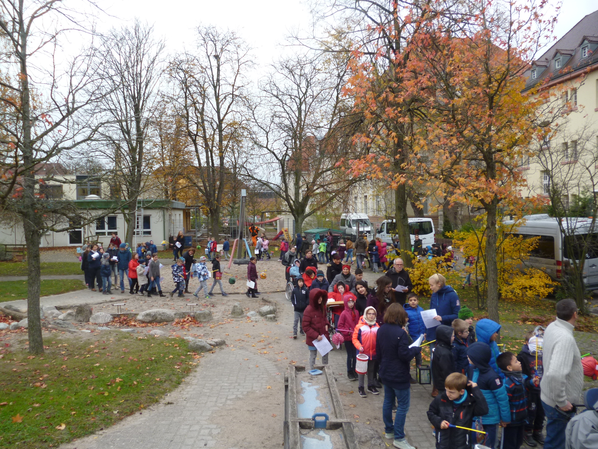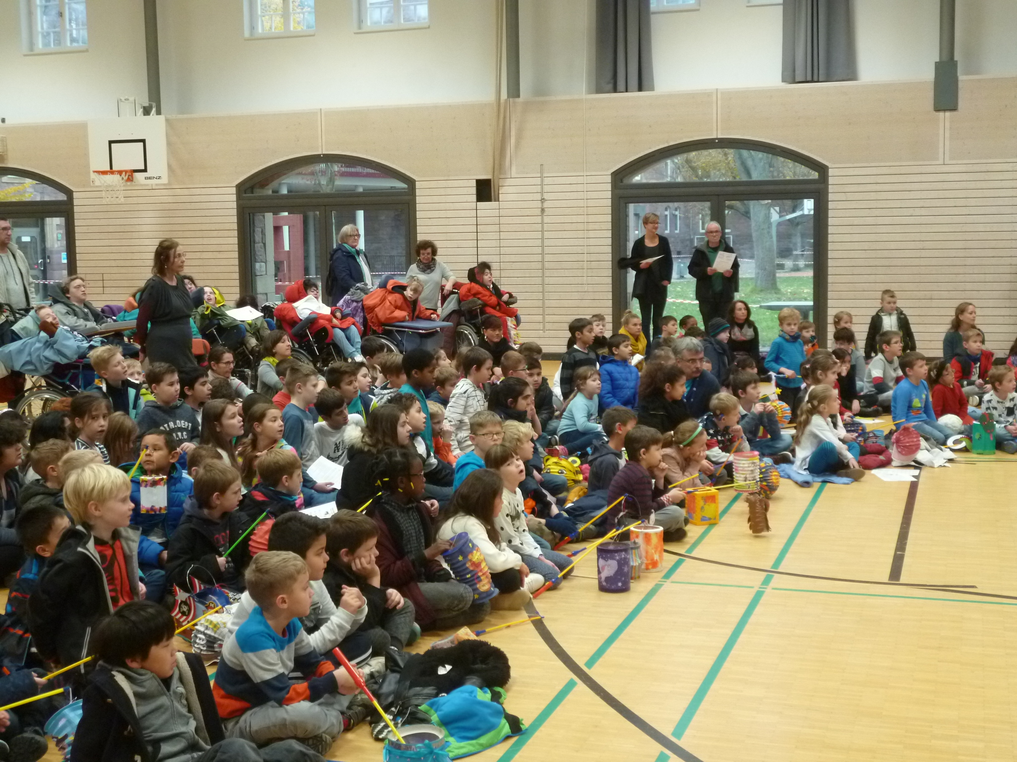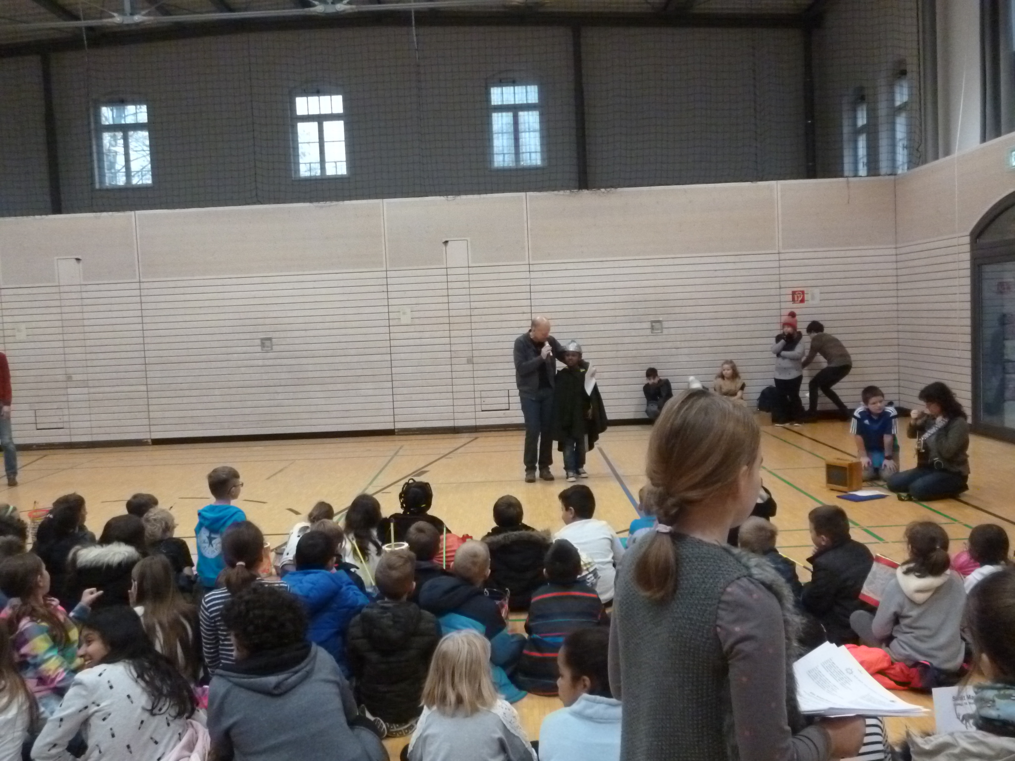 Am Freitag, den 10. November 2017 feierten die Grundschüler traditionell den Tag des Heiligen Martin. Um 9:00 Uhr trafen sie sich dafür in der EKS-Halle und sahen dort in einem kurzen Theaterstück der Sketch-up-AG die Geschichte des St. Martin, der seinen Umhang mit einem armen Mann teilte. Anschließend sangen sie, begleitet von Frau Heinold an der Gitarre, die ersten Strophen von „Ich geh mit meiner Laterne“, „Sankt Martin“ und „Ein bisschen wie Sankt Martin“. Dann durften die Kinder ihre Laternen anmachen und zum Laternenumzug im Schulgelände gehen. Dabei sangen alle die vorher geübten Lieder und versammelten sich zum Abschluss um ein Lagerfeuer, wo sie die von der Schülerfirma bereitgestellten Hefegänse miteinander teilten.