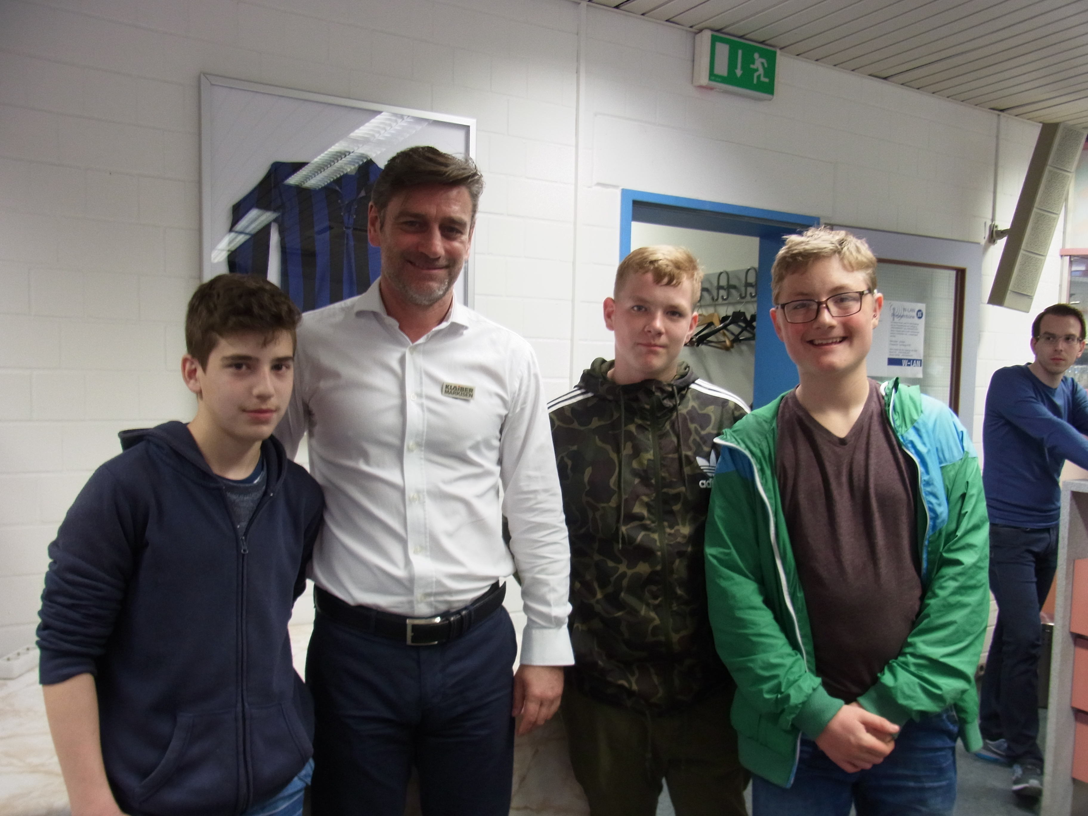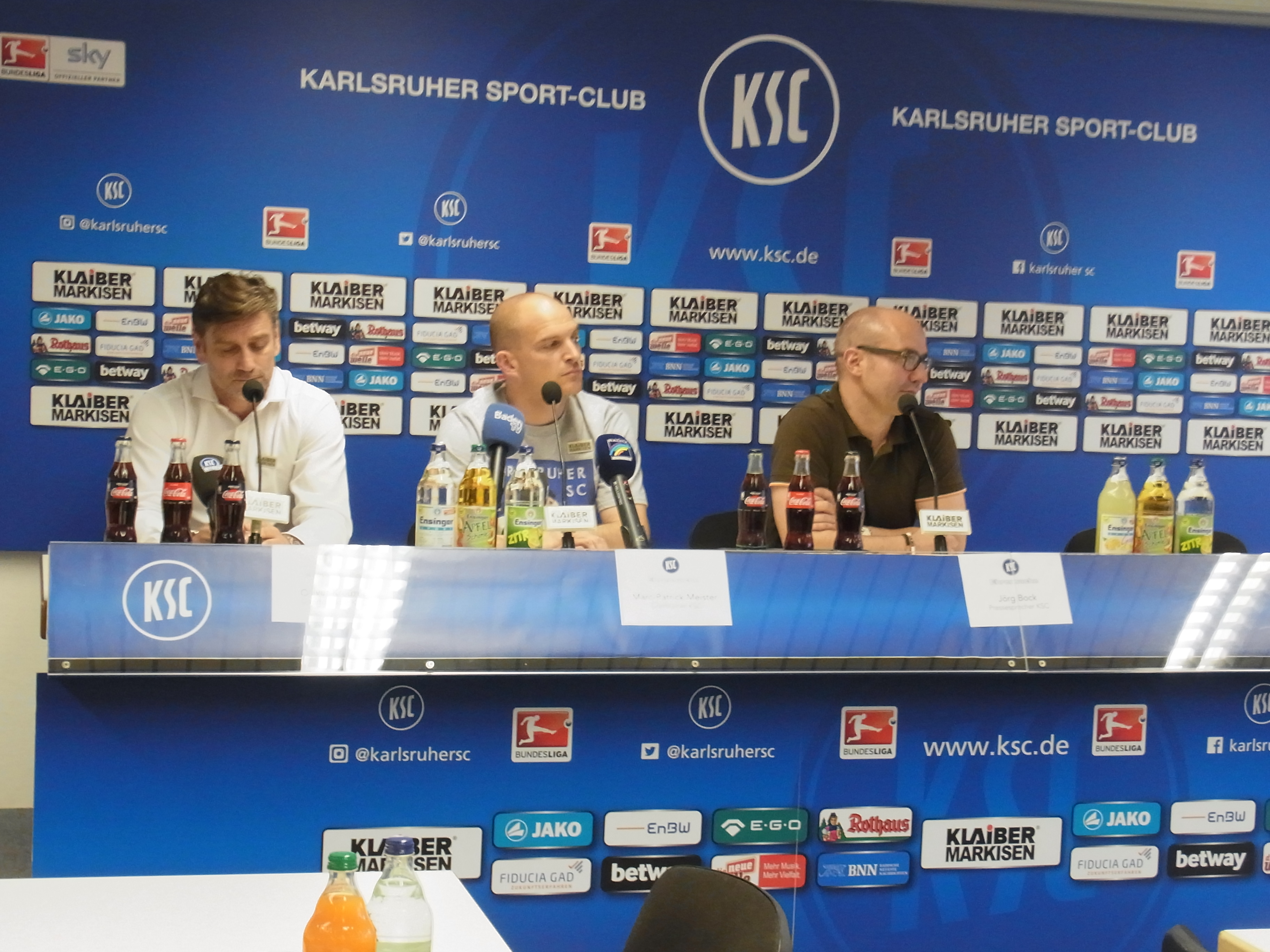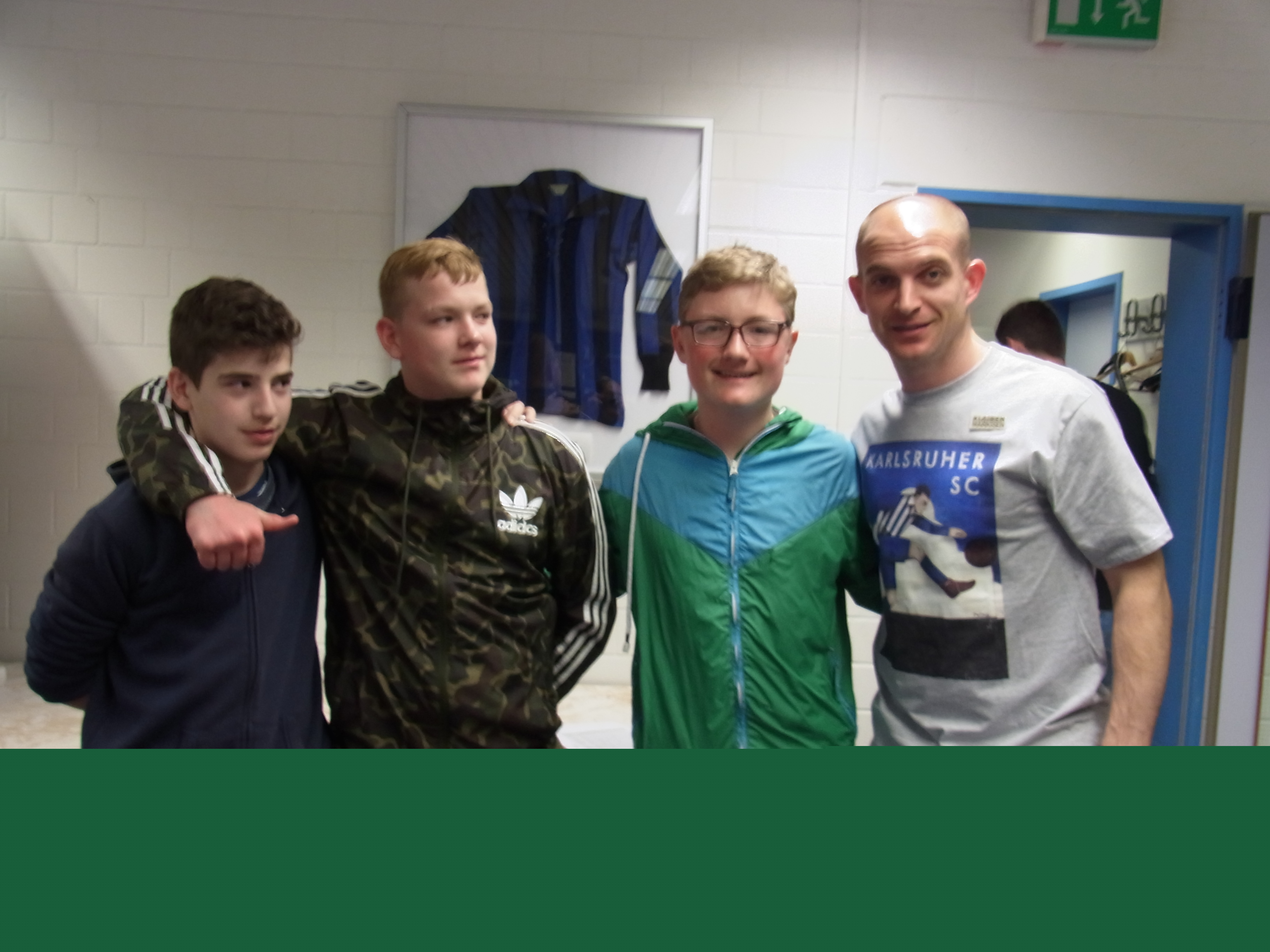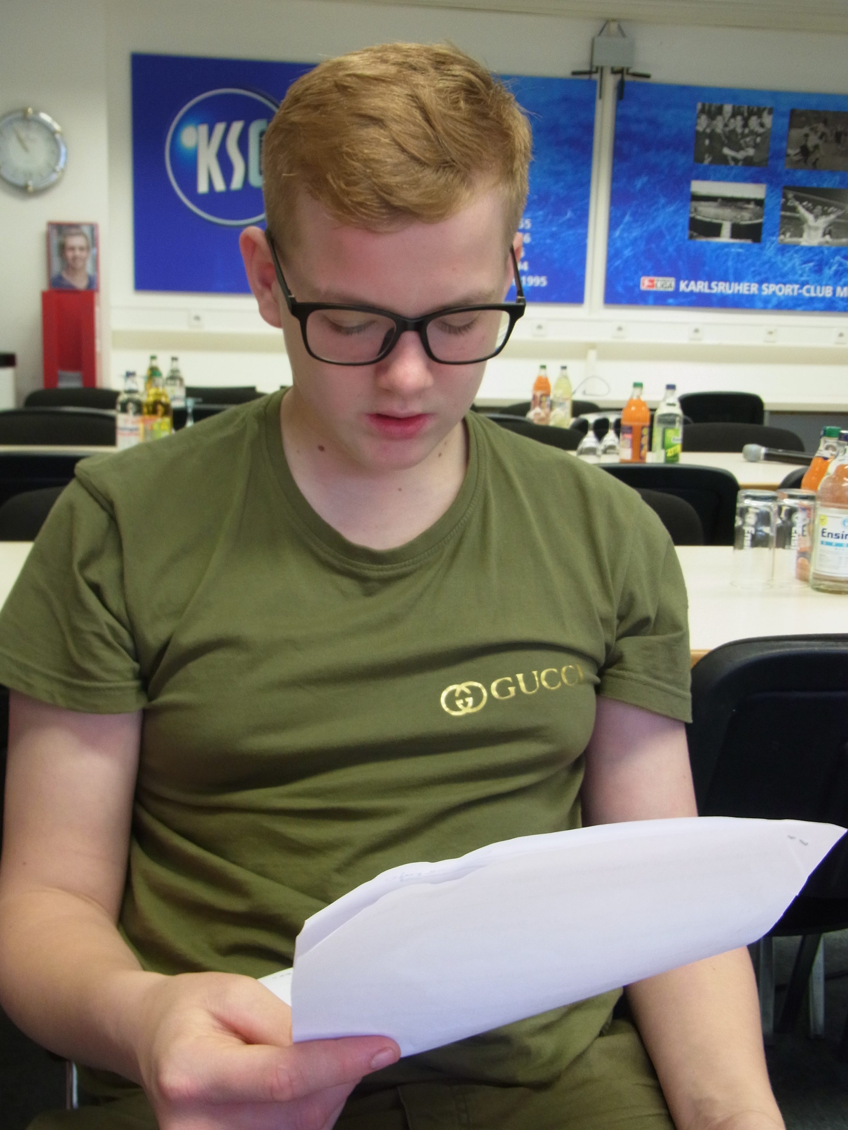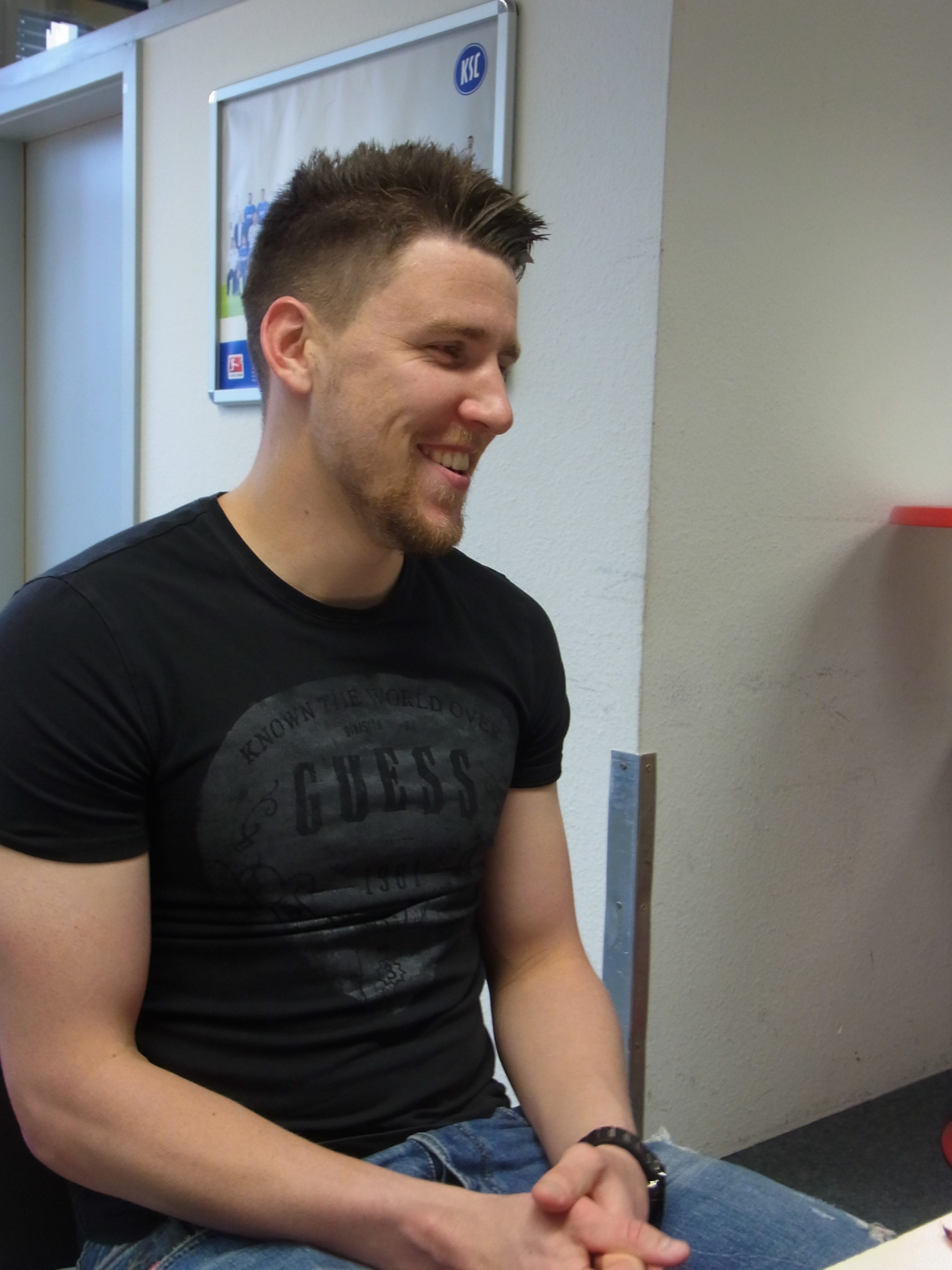 Eine besonders tolle Idee für ihren praktischen Teil hatten drei Schüler der Klassen 7a/b und 7c, deren Thema in ihrer Projektwoche „Fußball“ war. So organisierten Sergio, Emircan und Elias mithilfe des Pressesprechers des KSC, Herrn Bock (siehe Foto oben), ein Treffen mit dem Torwart des KSC, René Vollath, um mit ihm ein Interview zu führen.