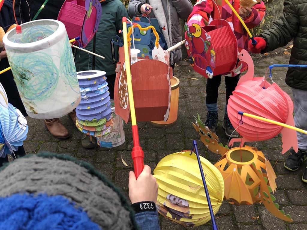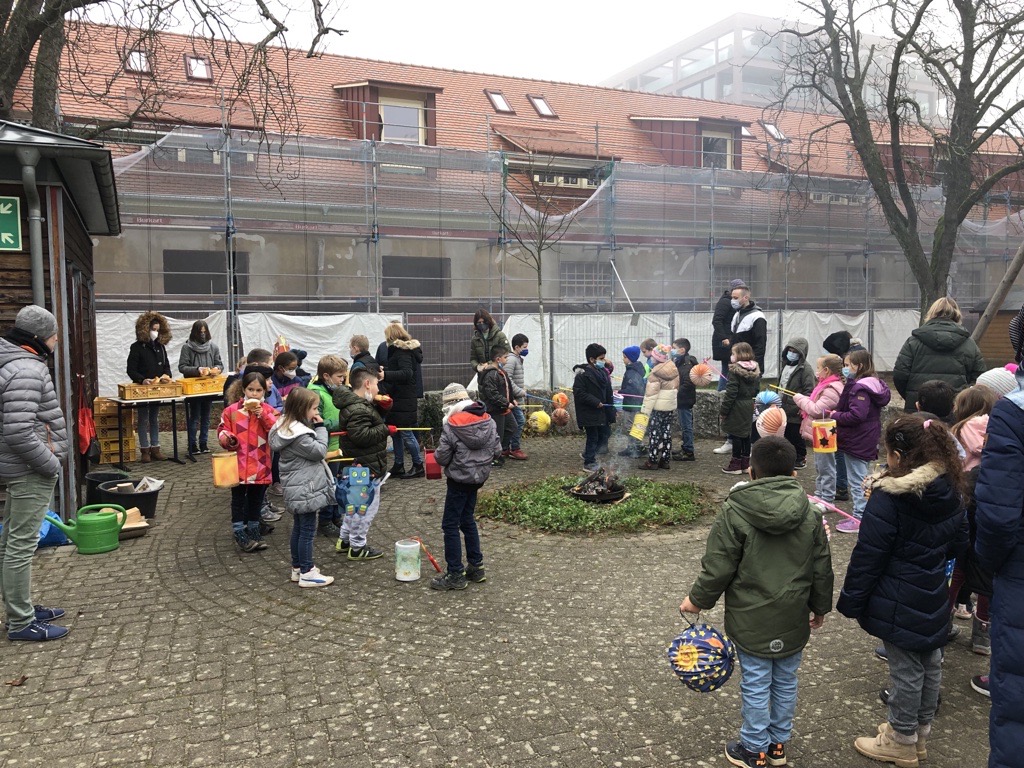 Mit ihren Laternen ging es dann weiter zum Wasserspielplatz, wo ein wärmendes Lagerfeuer auf die Schülerinnen und Schüler wartete. Auch auf die Hefegänse musste dieses Jahr niemand verzichten, nur das Teilen und Verteilen hatten die mit Handschuhen und Masken ausgerüsteten 8Klässler*innen übernommen. Nach dem gemütlichen Beisammensein ging es für die Kleinen zurück zur Schule und die 3. und 4. Klassen waren an der Reihe.
