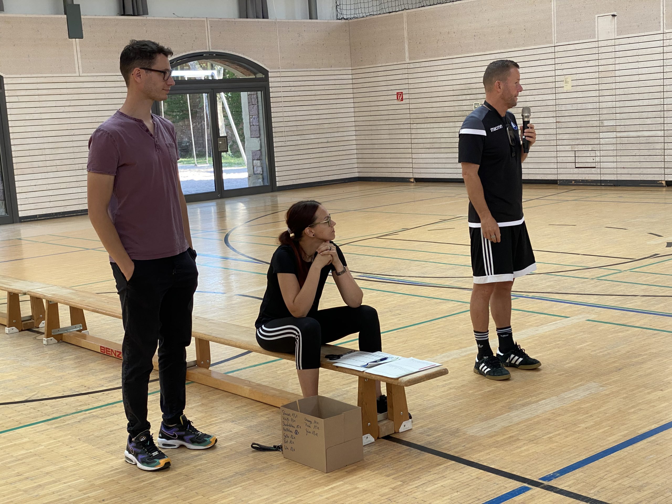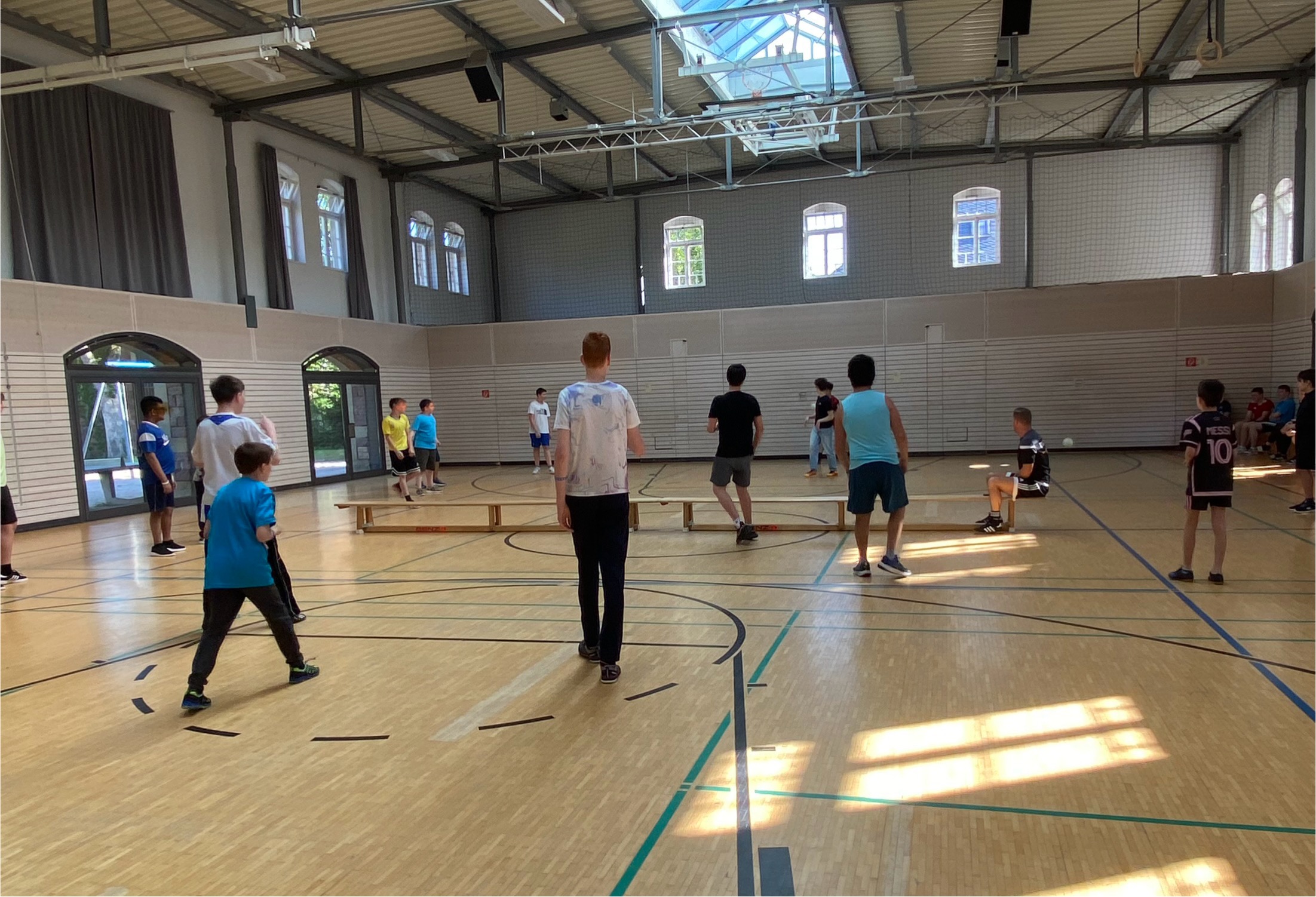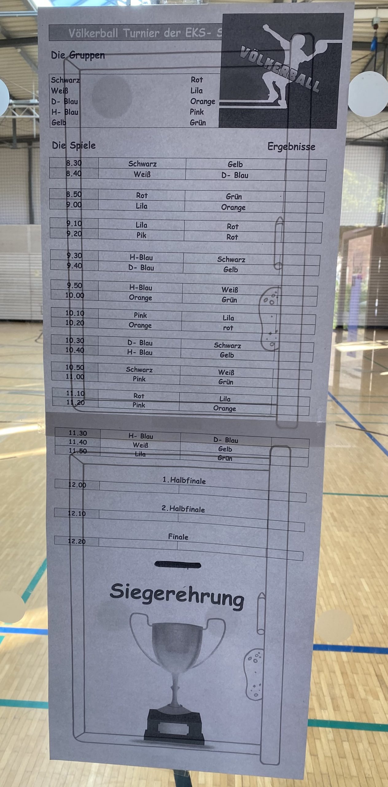 Sportlich wurde es bei uns am Montag, den 24.Juni 2024, denn da versammelte sich die Sekundarstufe in der EKS-Halle, um gemeinsam ein Völkerballturnier auszutragen. Dafür hatten Frau Koppe und Herr Settelmeyer im Vorfeld klassengemischte Gruppen zusammengestellt, die sich nun mit einem farbigen Armband kenntlich machten.