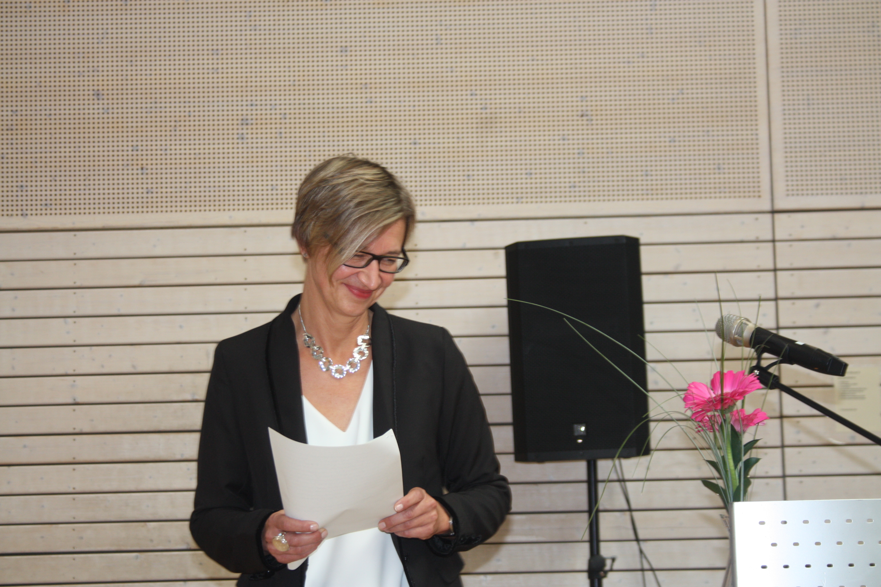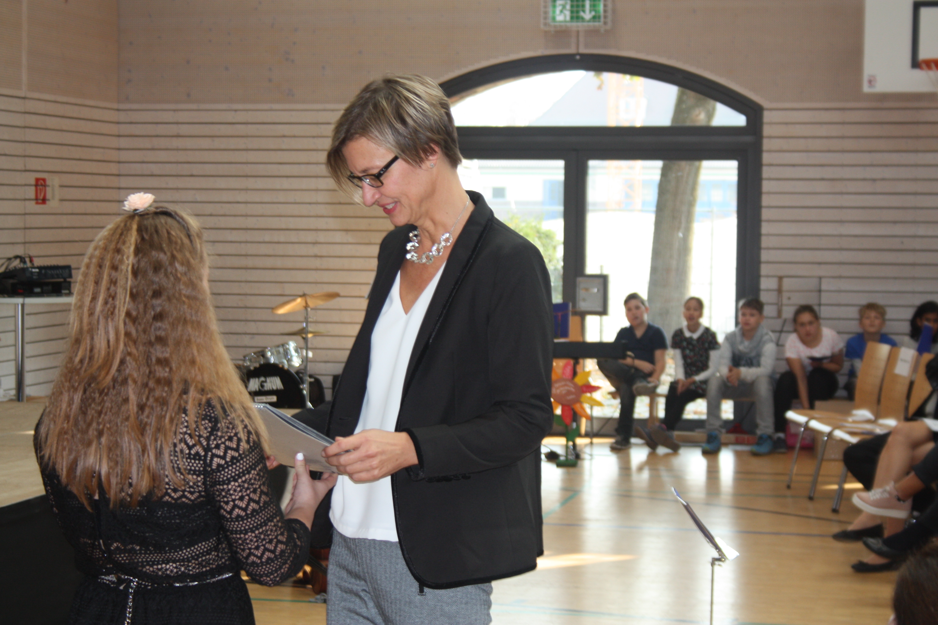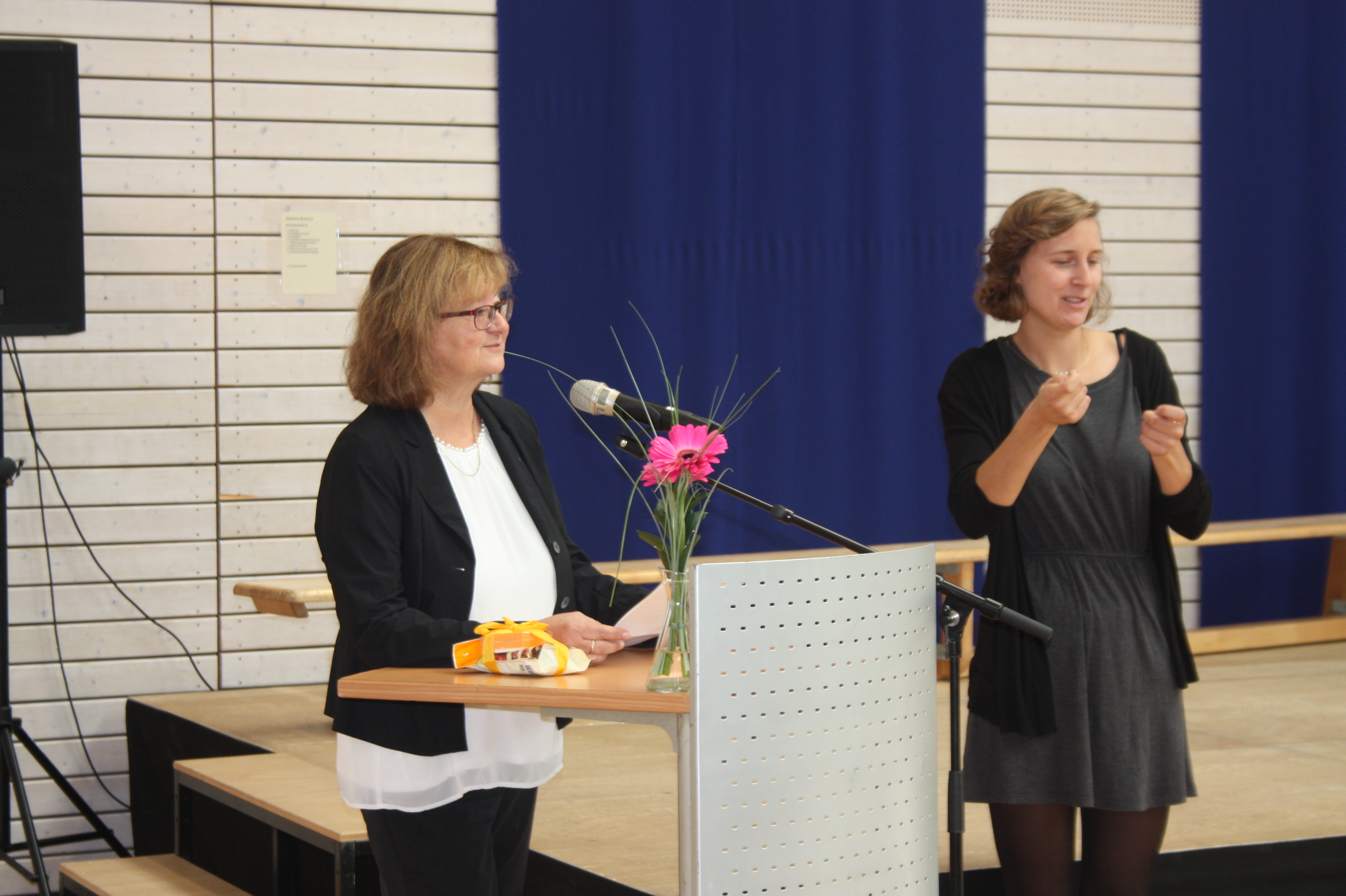 Am Freitag, den 19. Oktober 2018, wurde Frau Daniela Kretschmer feierlich als unsere neue Sonderschulrektorin in ihr Amt eingeführt. Dafür hatte sich die Schulgemeinschaft ein buntes Programm überlegt. Als Einstimmung auf die Feierlichkeit und die kommende Zeit sang der Schüler-Lehrer Chor gemeinsam mit der Lehrer-Band den Charthit „Zusammen“ von den Fantastischen Vier. Durch das Programm führte unsere Konrektorin Frau Hielscher-Füeß. Sie begrüßte alle Anwesenden und dankte Frau Kretschmer für die gute Zusammenarbeit. Im Anschluss übernahm der zuständige Schulaufsichtsbeamte, Herr Schlindwein vom Staatlichen Schulamt Karlsruhe, die Amtseinführung, bevor Frau Beer vom Schul- und Sportamt Karlsruhe ihre Glückwünsche aussprach. Musikalisch ging es weiter mit der „Pizzicati“- Aufführung der 2.Klassen, in deren Anschluss die Vorsitzende des Örtlichen Personalrats, Frau Blume, ebenfalls einige Worte sprach. Frau Kretschmers langjährige Kolleginnen aus der Beratungsstelle wünschten ihr viel Glück für das zukünftige Amt. Weiter ging es im Programm mit dem Gebärdenchor „Fliegende Hände“, der ein Gebärdenpotpourri präsentierte, welches von vielen guten Wünschen aus dem Kollegium untermalt wurde. Dann war es an der Zeit für die Elternbeiratsvorsitzende, Frau Wolters und die beiden SchülersprecherInnen, Angelina und Sergio, die stellvertretend für Eltern und SchülerInnen ihre Glückwünsche vortrugen. Auch die SchülerInnen der Klasse 9a gratulierten Frau Kretschmer und überreichten eine selbstgebaute Holzblume mit ihren Wünschen. Bevor der Chor das Programm mit dem Lied "Das wünsch ich dir" zum Abschluss brachte, bedankte sich Frau Kretschmer bei allen Beteiligten, sowie bei ihrer Familie und allen, die sie auf ihrem Weg begleitet haben.